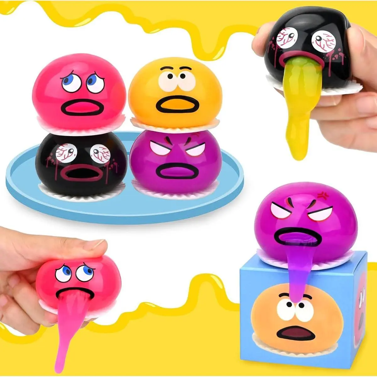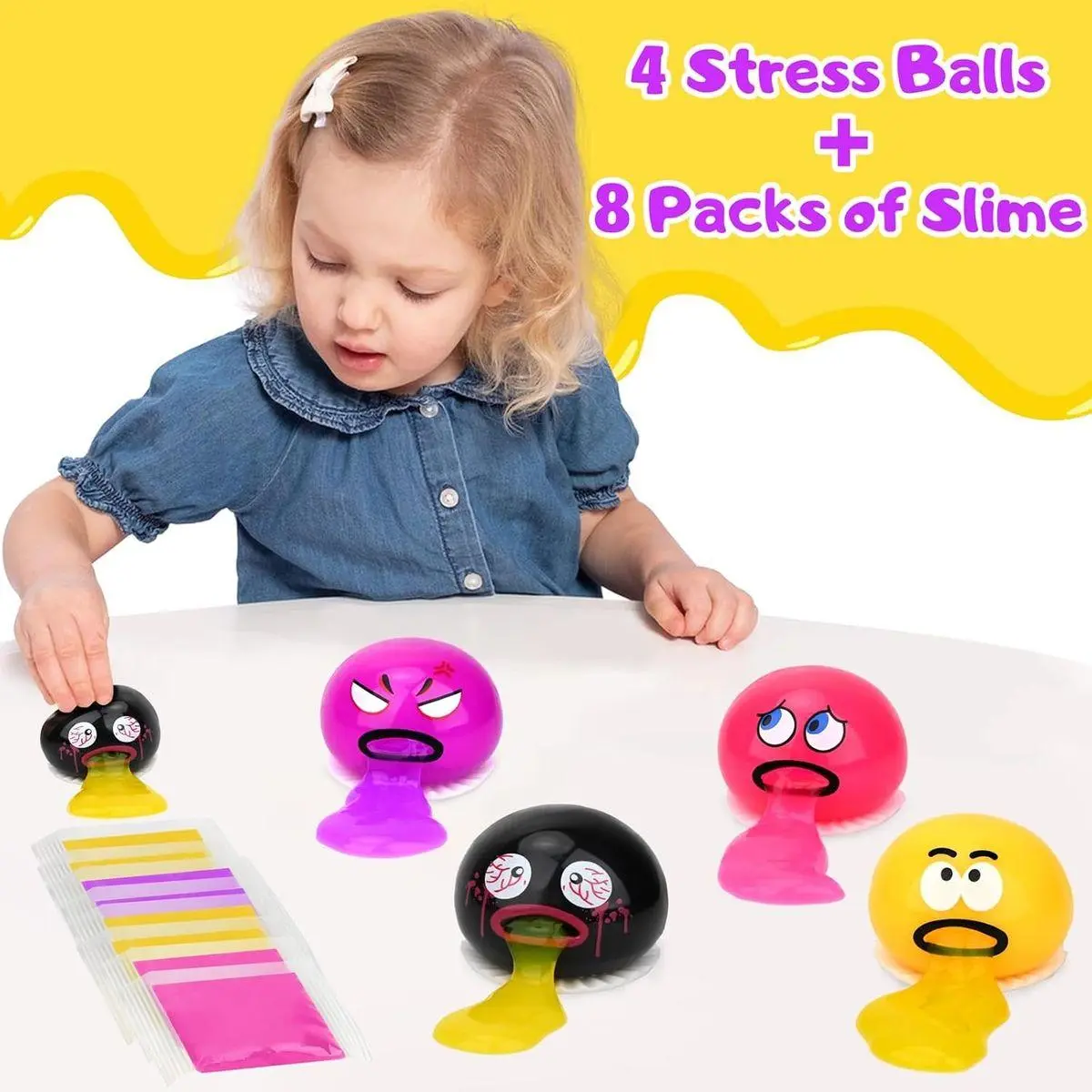 Great Value 4-Pack with 8 Slime Refills: You get incredible value with this complete set! It includes 4 different vomiting stress balls with unique, funny facial expressions and a whopping 8 packs of slime refills. This means the fun doesn’t have to stop. It's perfect for sharing with friends and family so everyone can join in on the gross-out fun