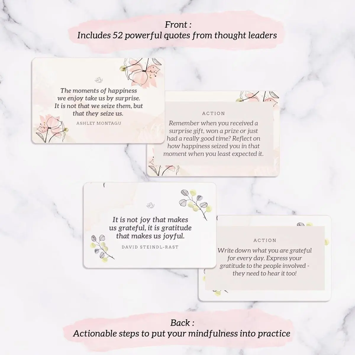 QUALITY IN THE DETAILS - MESMOS positive affirmation cards for adults are beautifully designed and include 52 business-sized quote cards on quality card stock (3.3 x 2.1 inches), foldable stand and a calming watercolor and flower design to promote relaxation and tranquility.
