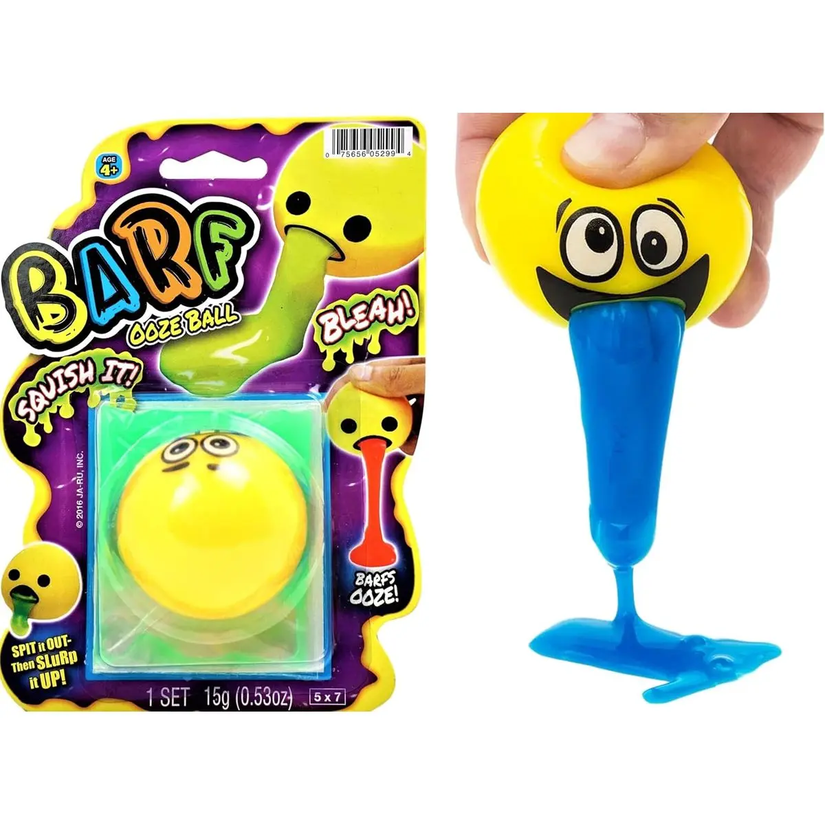 2 Pack of Barf Ooze Balls- Our puke stress ball is squishy with slime inside. Assorted slime color (blue, pink, green). Just squeeze out the slime out of the squishy stress ball. Plus 1 JA-RU Bouncy Ball.