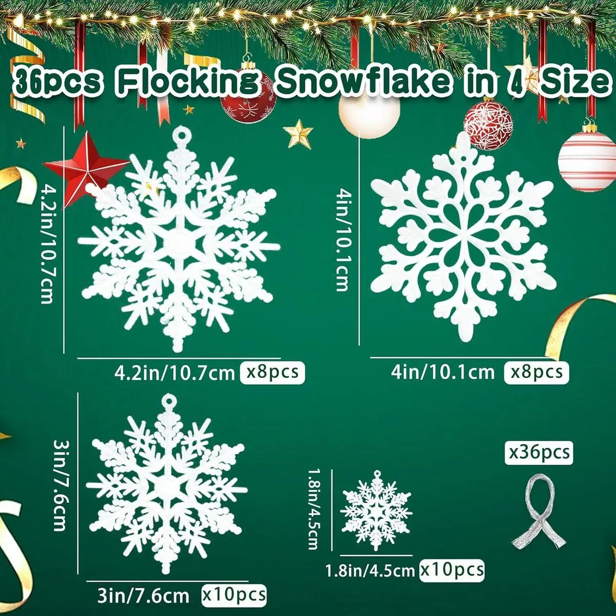 What You'll Receive: The snowflake ornaments set include 36 white Christmas snowflake ornaments in 2 elegant designs, featuring 4 sizes for versatile decorating: 8pcs for 4.2 inches, 8pcs for 4 inches, 10pcs for 3 inches, and 10pcs for 1.8 inches. Each white flocked Christmas ornament comes with a silver hanging string for easy display