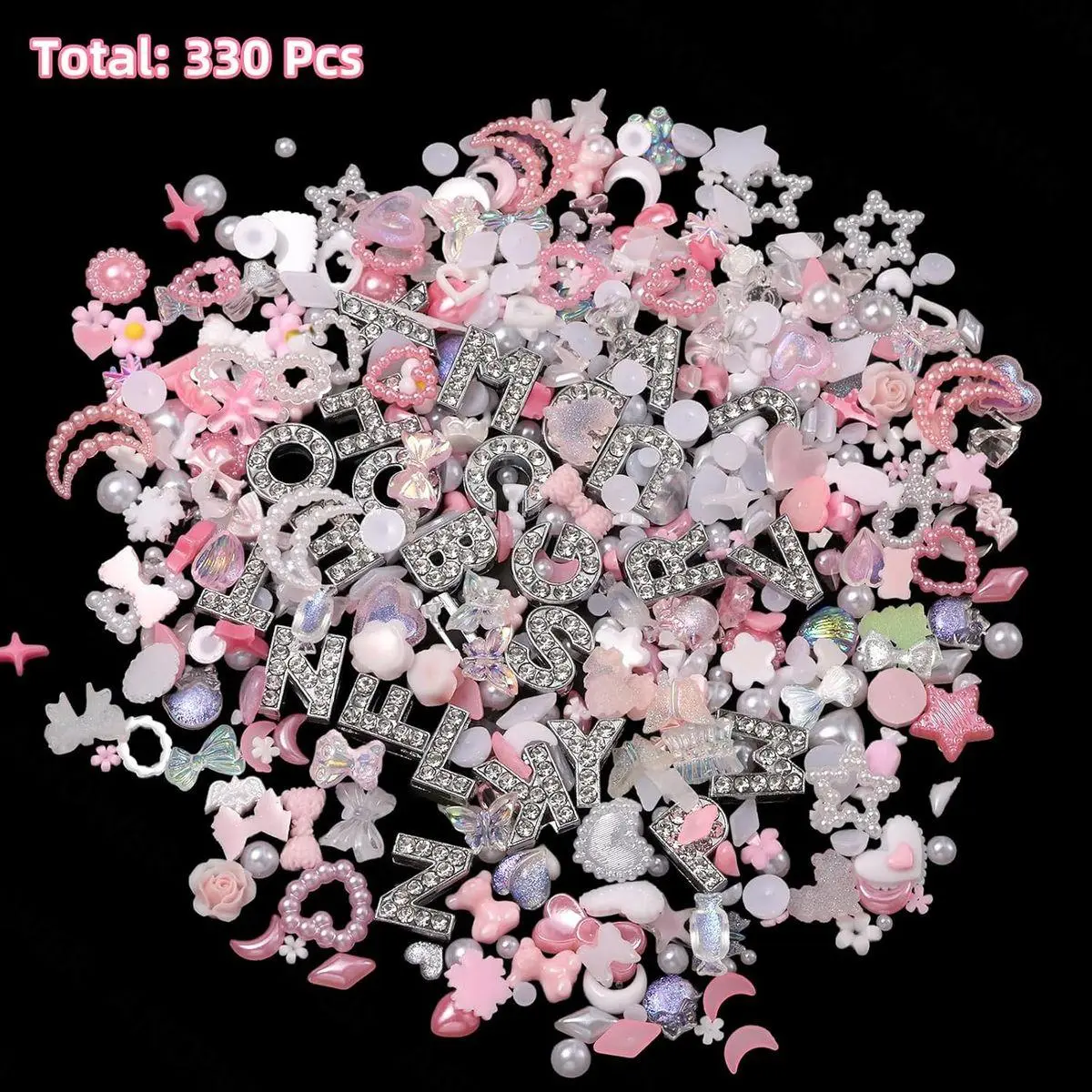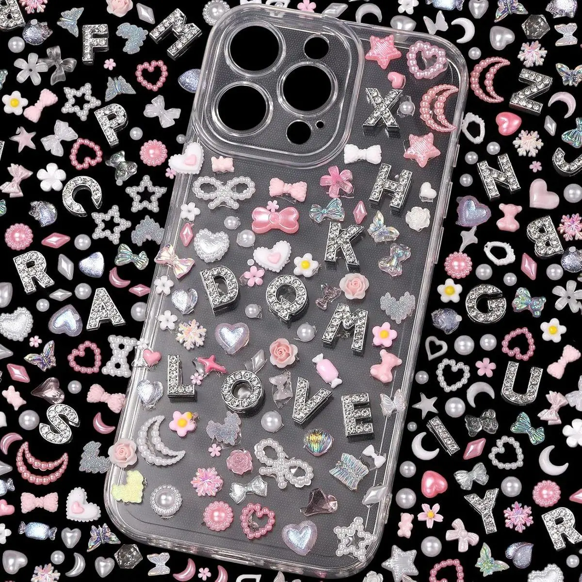 Assorted Junk Case Charms Kit: The junk case kit contains various of shapes cute nail charms, like A-Z alphabet letters charms, pearls heart charms, pearls star charms, pealrs moons charms, pearls bows charms and butterfly charms etc. Enough quantity meet your needs