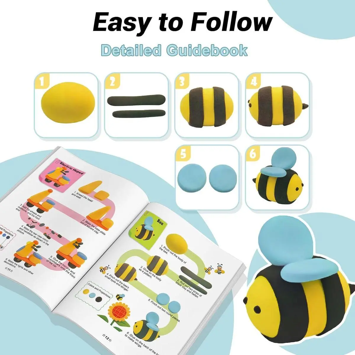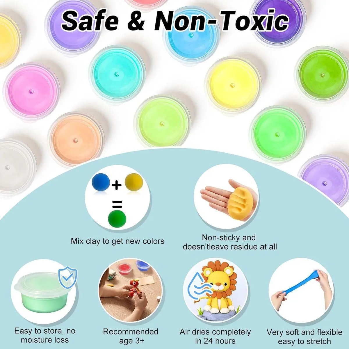 【Safe & No-Baking】 Our air dry modeling clay is made of 100% safe and high-quality material. Non-toxic, environmentally friendly, odor-free, non-sticky hands. Strictly complies with the ASTM D-4236 and CE (EN-71) standards. Air dries completely in 24 hours. Can't be Baked in the oven!