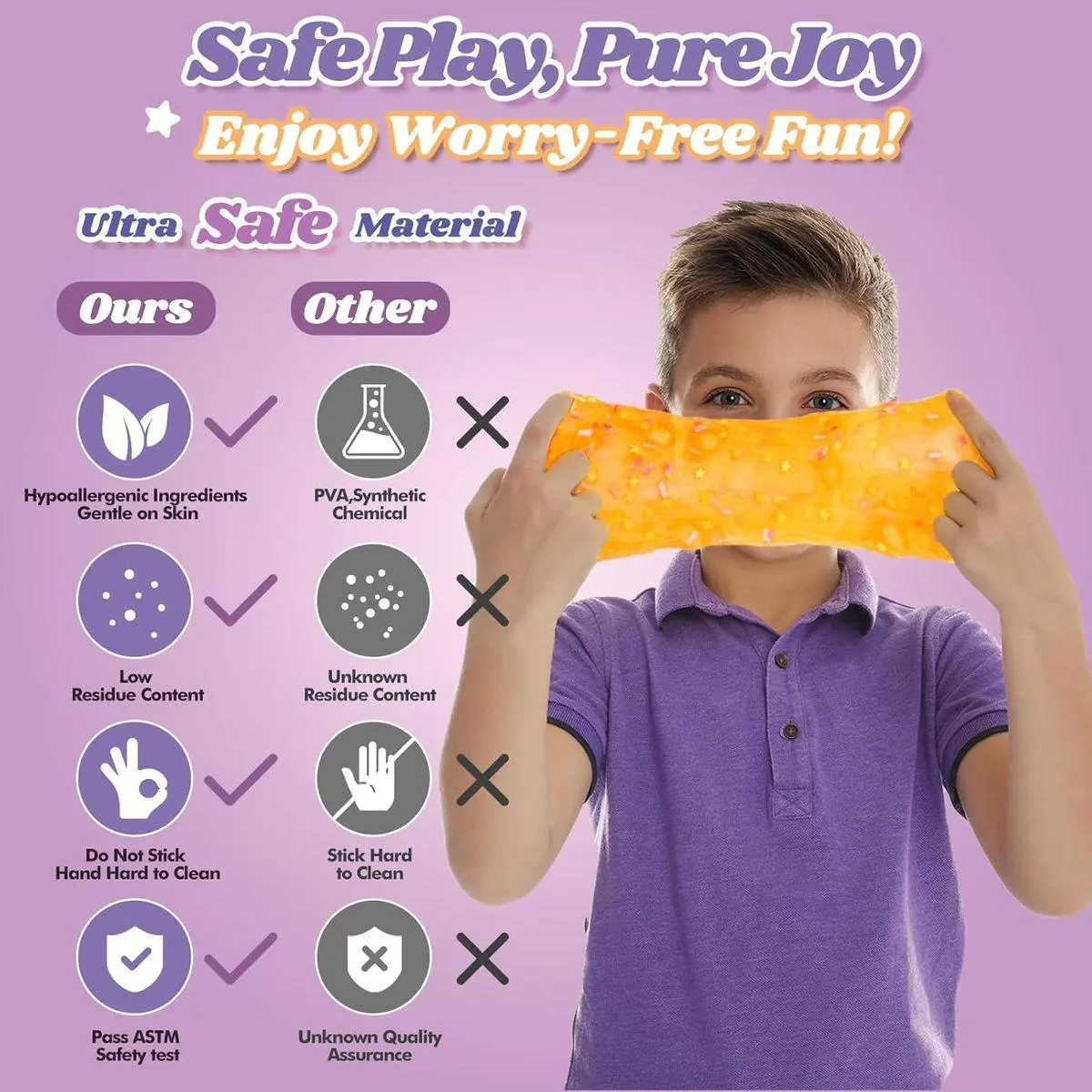SLIME FOR KIDS: Experience the satisfying crunch of our clear jelly cube slime with every squeeze! The clear slime is packed with fun jelly cubes that create a satisfying sound and texture, making it perfect for stress relief or sensory play. Stretch, squish, and squish again for hours of fun!