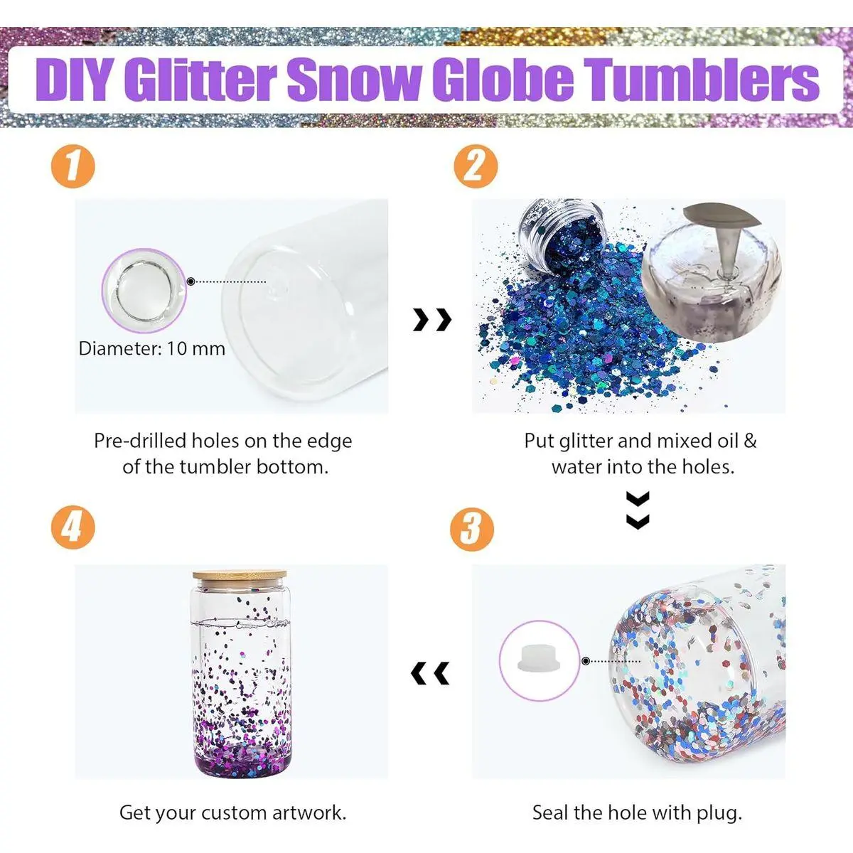 SNOW GLOBE TUMBLER: Double walled design provides a sweat proof and condensation free cup exterior to prevent drips on the table. Pre -drilling design at the bottom, you can add glitter and rhinestone in and seal it, the glass can instantly turn into a beautiful snowglobe. You can easily complete your masterpiece!
