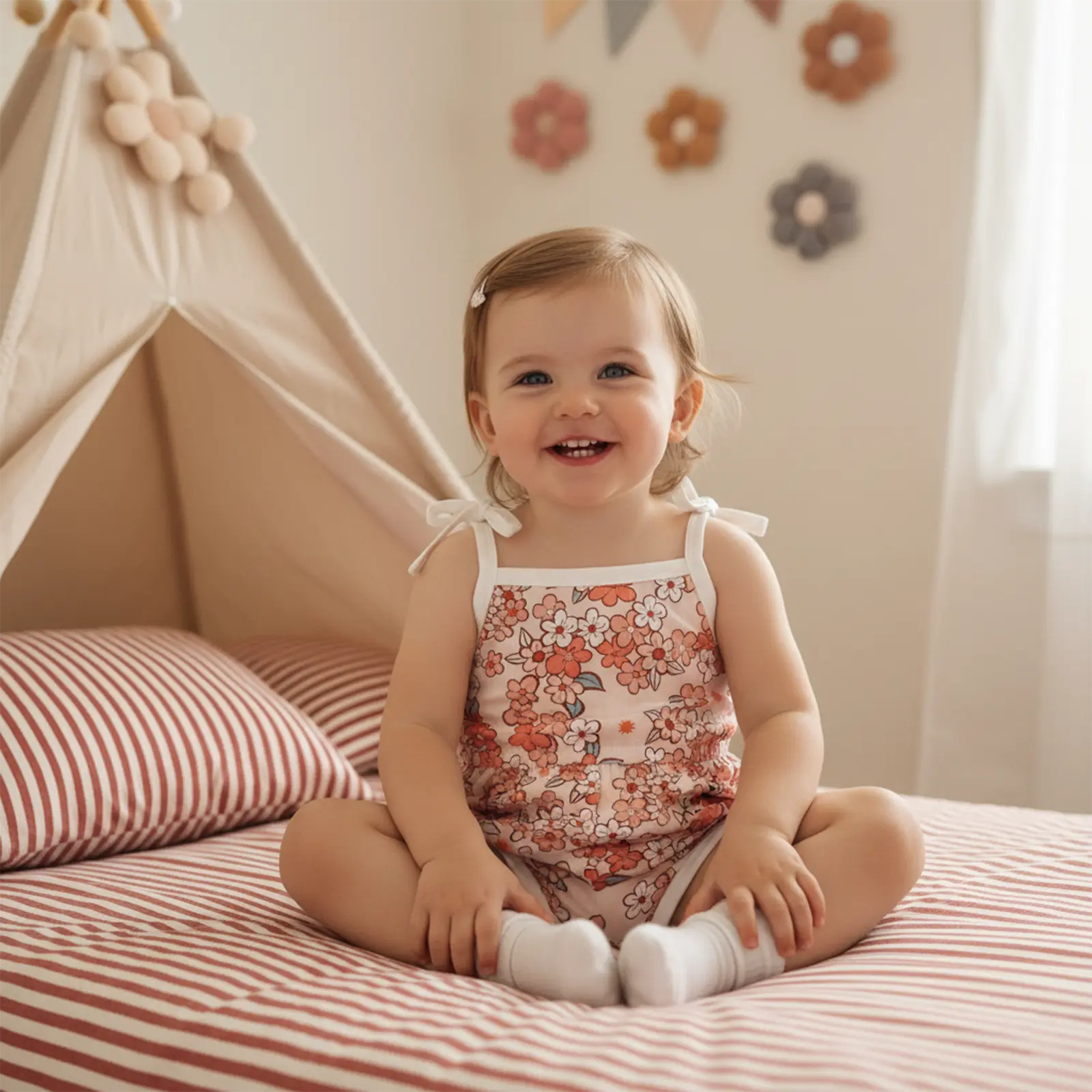 Toddler Baby Girl Summer Jumpsuit, Cartoon Flower Print Sleeveless Sling Tie-Up Shorts Romper