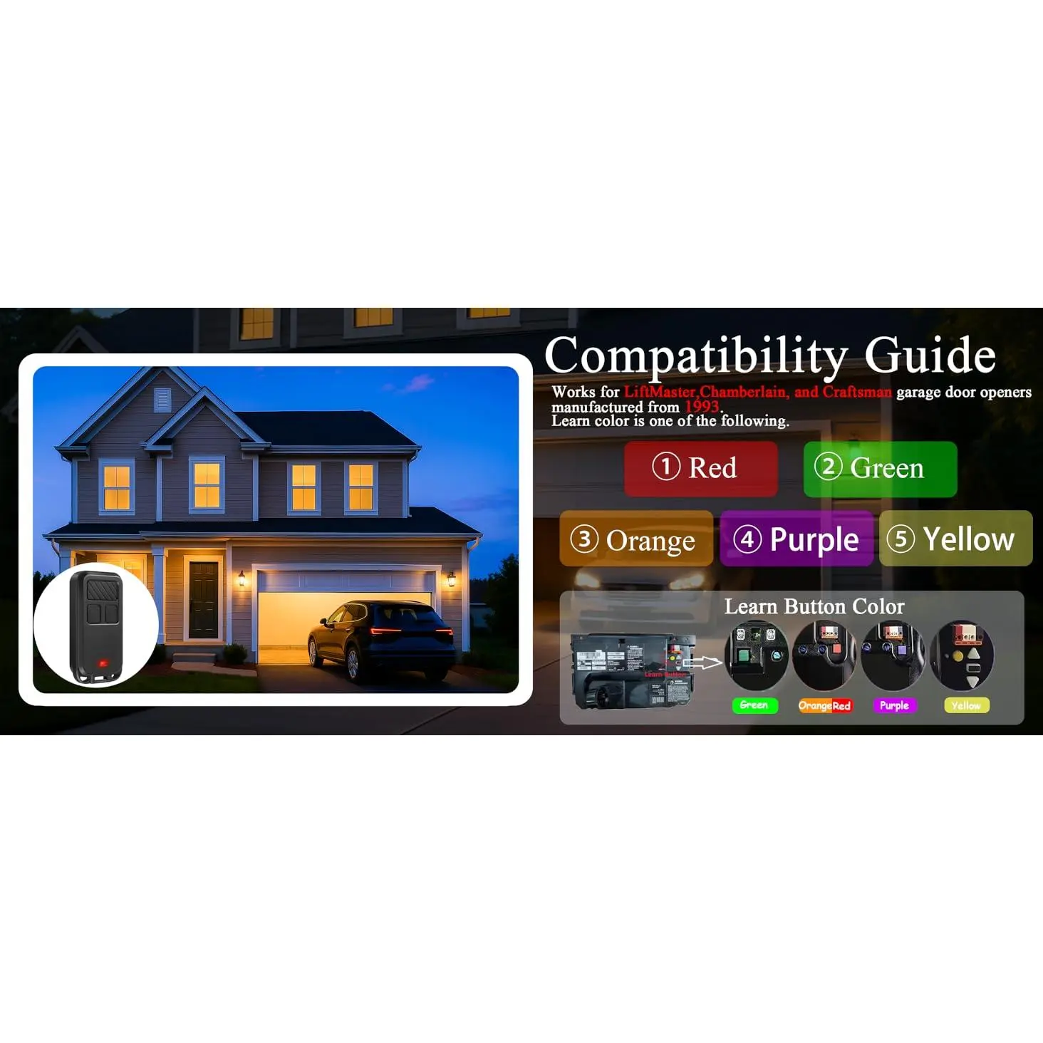 Compatible with LiftMaster, Chamberlain, and Craftsman openers made after 1993.Just check your Learn button color-red, green, orange, purple, or yellow-and you’re good to go.Fast setup with reliable performance across popular models.