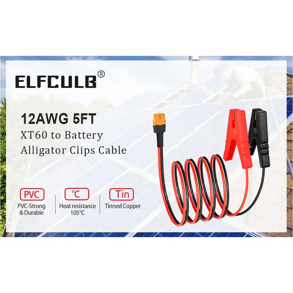 [XT60 to Alligator] Constructed with 12AWG UL1015-certified tinned copper wiring and industrial-grade PVC/Nylon housing.Features double-layer insulation for heat/flame resistance (600V rated)[Tinned Pure Copper] With low resistance, antioxidant, anti-corrosion and good electrical conductivity, providing stable current for your device[Universal Compatibility] XT60 interface seamlessly connects solar generators (Jackery/Goal Zero/Bluetti) and RC battery systems.Spring-loaded copper-alligator clips accommodate 4-10mm terminals (cars/boats/UTVs)[Wide Application] Ideal for emergency jump-starts (car/motorcycle), solar array integration, and power station charging.Cable lenth: 5FT[You Will Get] ELFCULB 12AWG 5FT XT60 to alligator clips cable & 24 months friendly customer servic.Please contact us if you have any issue, we will reply and solve within 24 hours.(Note: Before Using Please Make Sure the Positive and Negative Poles are Correctly Matched)