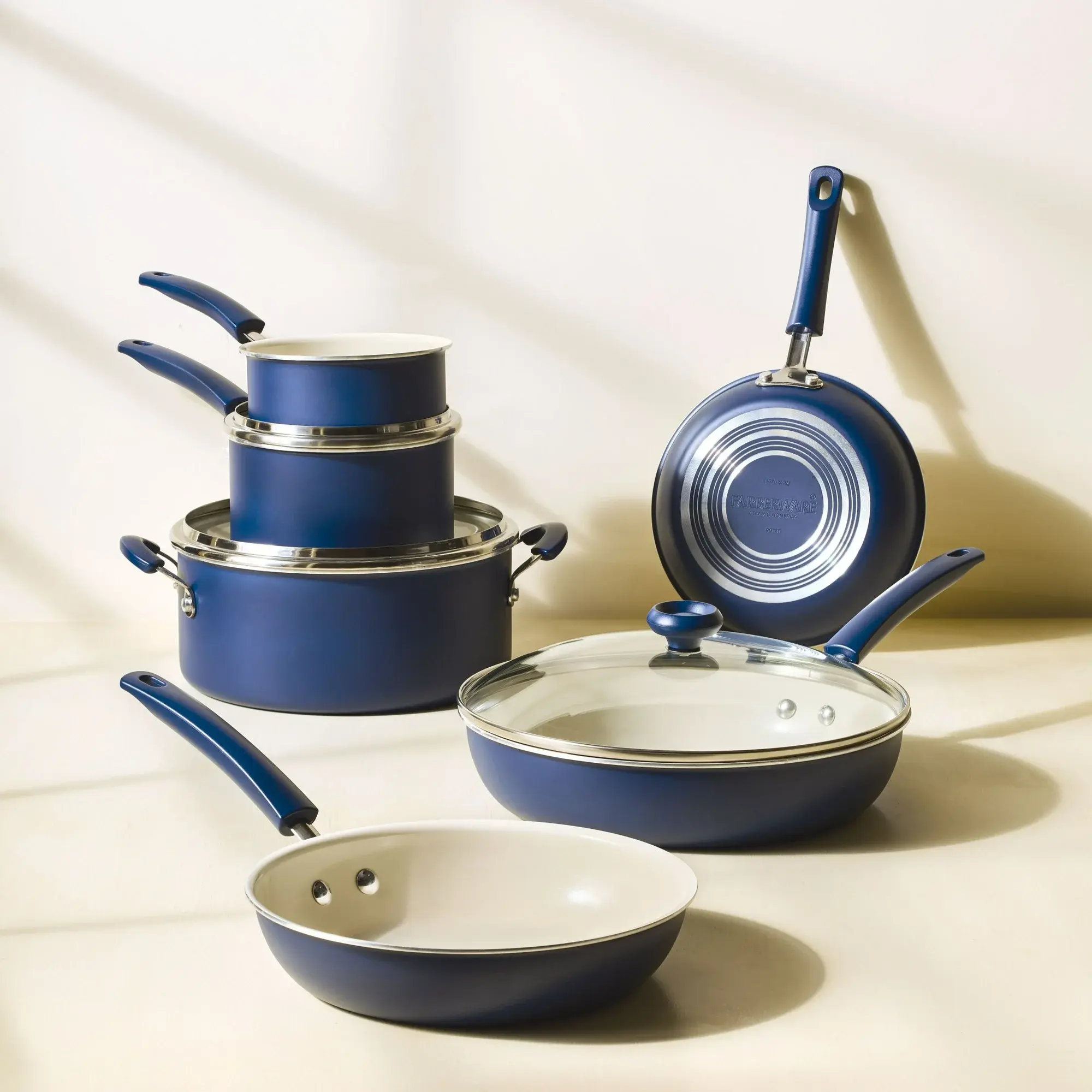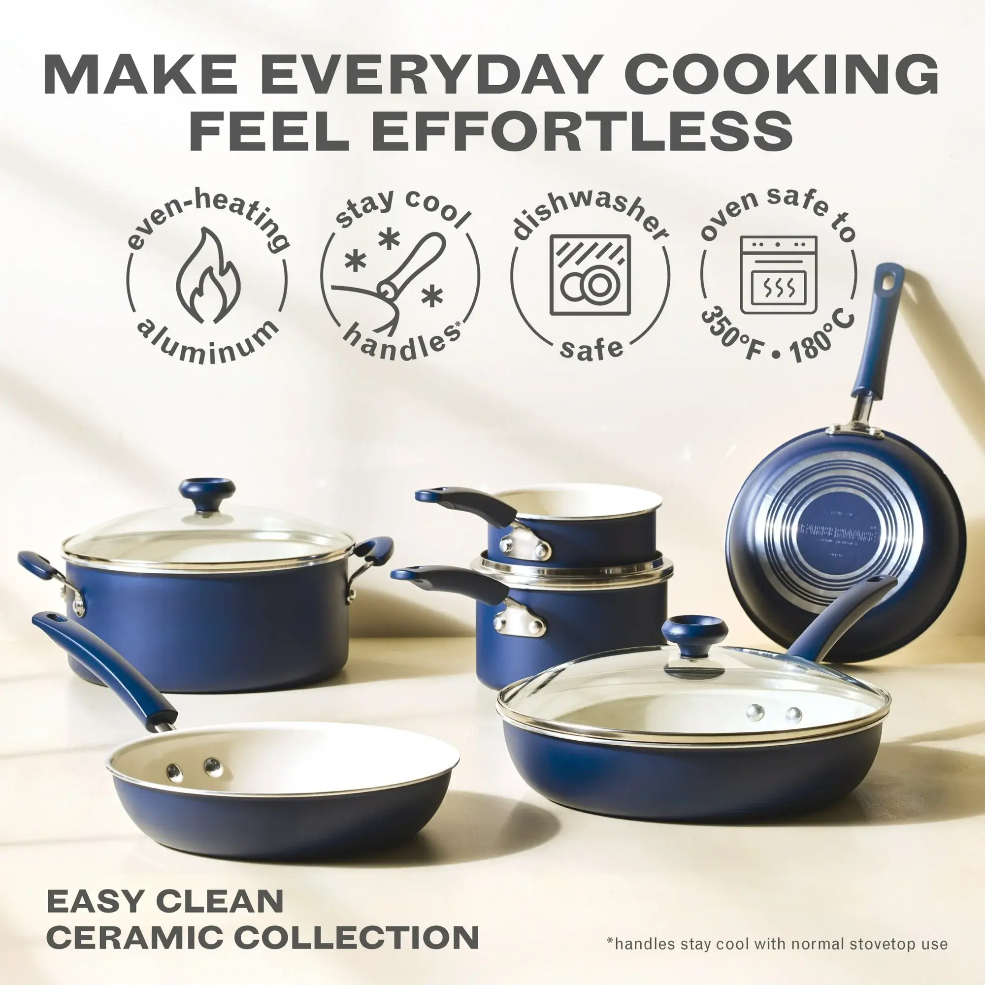 Farberware Easy Clean 14 Pcs Ceramic Nonstick Cookware Set with Cooking Tools, Dishwasher Safe, Blue, Green, Black