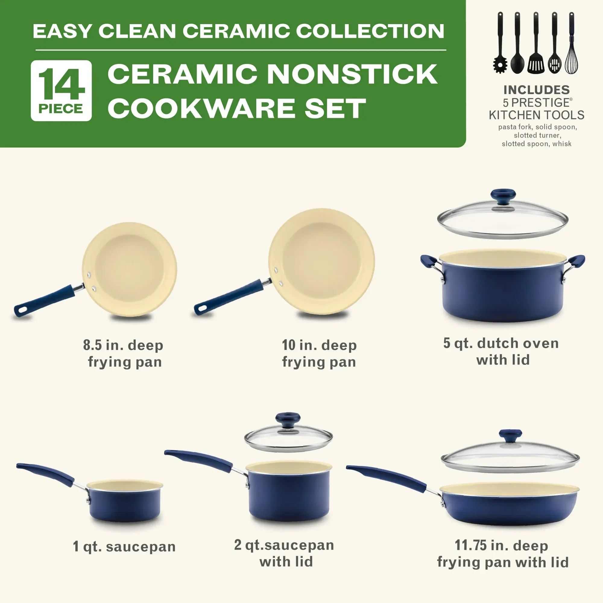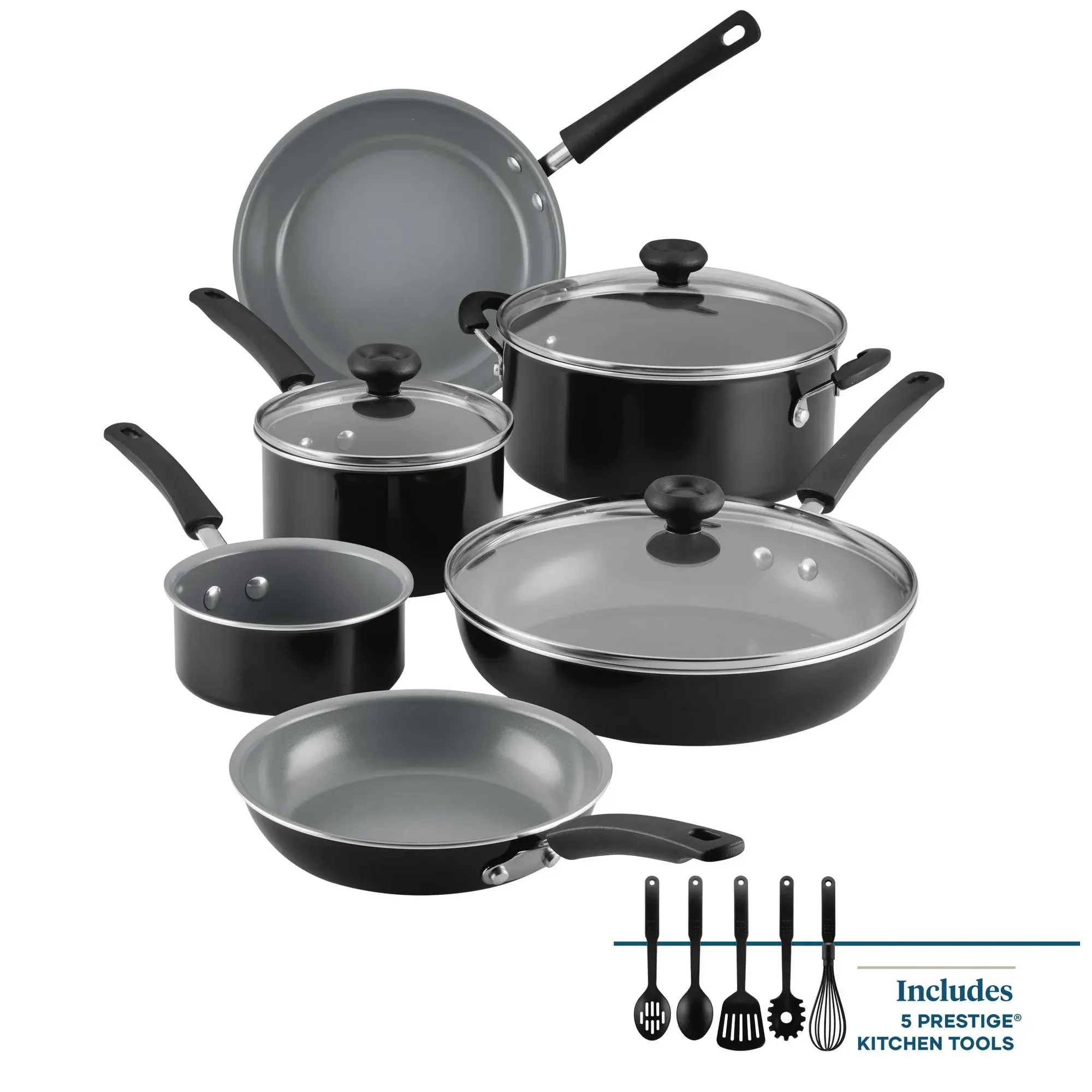The Farberware Easy Clean Pro 14-Piece Ceramic Nonstick Cookware Set provides everything you need to cook up family-friendly meals at home with the added benefit of non-toxic and easy-to-clean ceramic nonstick - Made from durable aluminum, the pots and pans in this set heat quickly and evenly to help you achieve optimal searing, saucing, frying, boiling, and more. Other features include tempered-glass lids so you can monitor the cooking process without losing heat or flavor and sturdy, stay-cool handles that provide a comfortable grip when cooking and serving. The cookware is dishwasher safe, oven safe to 350 degrees F, and comes with five nylon Prestige kitchen tools to complete the kitchen collection. (*Product design does not involve intentionally adding to the product any of these substances which may otherwise be present in the environment.)