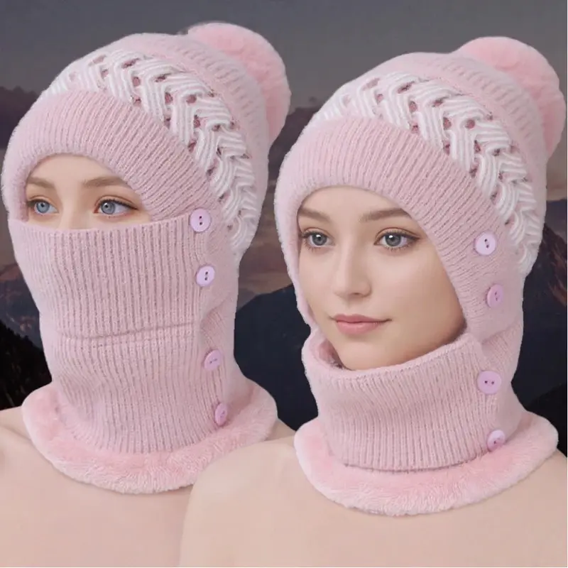 New Style Female Pompoms Winter Hats Plush Fur Lined Keep Warm Winter Hat Women Windproof Coldproof Thicken Balaclava Cap