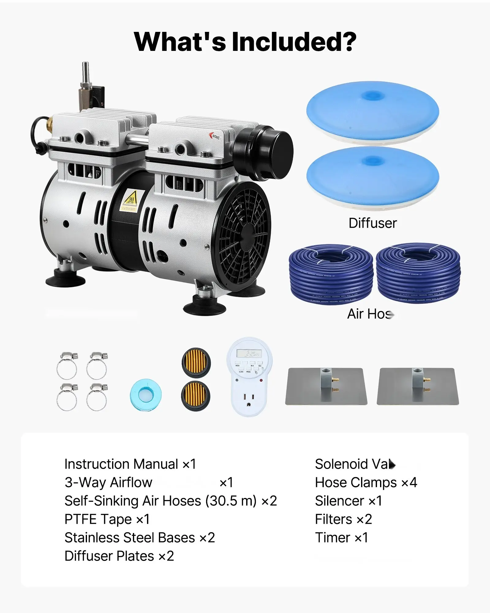 ·Complete Kit: The outdoor pond aerator comes with an air compressor, 2 pieces of 100 ft weighted self-sinking hose, 1 diffuser plate, timer, and all required accessories. Ready to assemble and run on a standard 120V outlet.