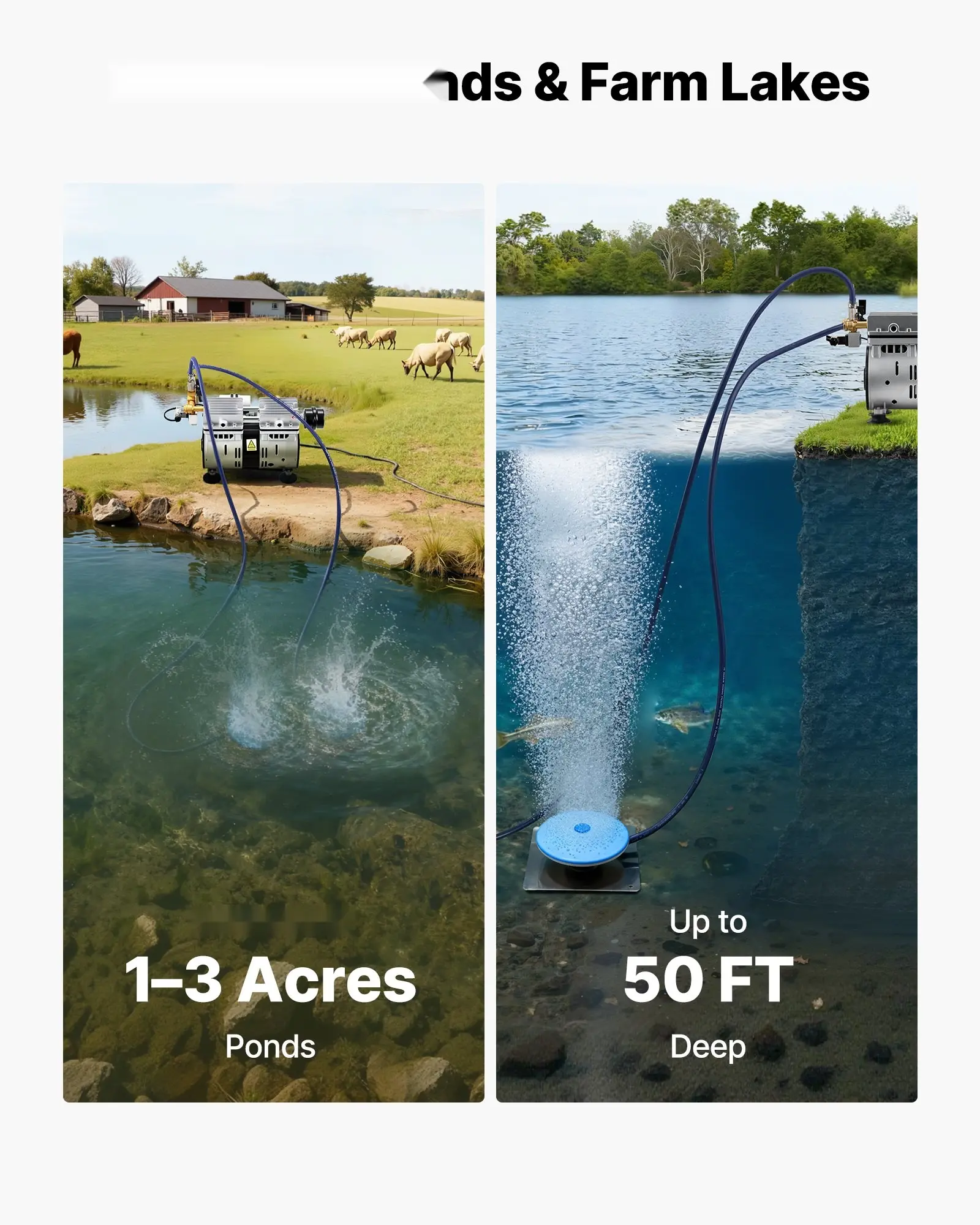 ·Aeration for 3 Acre Ponds: This pond aerator kit is suitable for 1- 3 acres and 50 ft deep ponds. This high-efficiency underwater aeration system helps prevent fish kill from low oxygen, reduces water plants, and cuts down on sludge buildupârestoring balance to your pond or farm lake