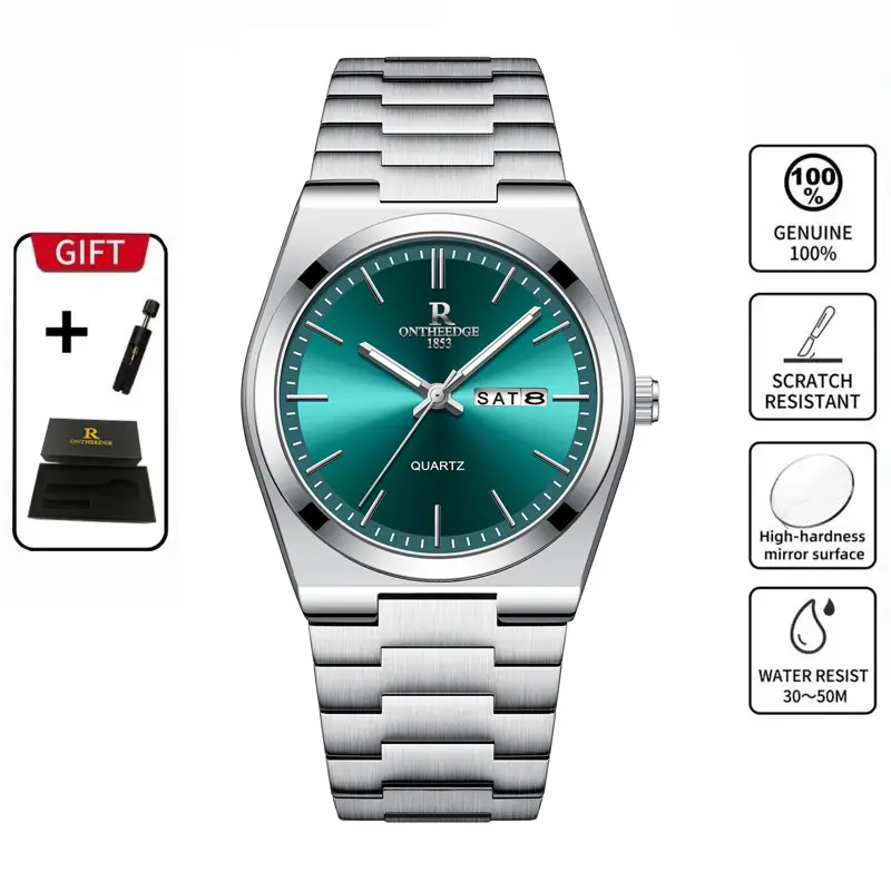 Men's Luxury Teal Green Dial Quartz Watch - Stainless Steel Wristwatch with Date Day Display, Waterproof, Luminous Hands, Classic Business Casual Dress Watch for Men, Perfect Gift for Husband Dad