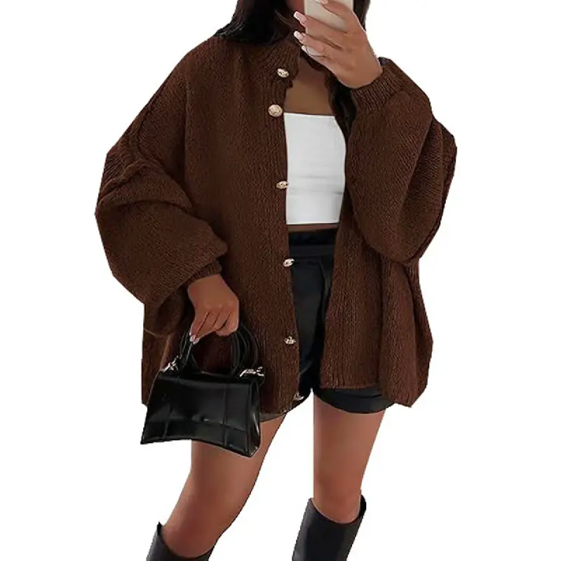 Features: Long lantern sleeve cardigans, chic golden button down sweater coat, high-cut collar sweater cardigans, loose fit sweaters, overcut shoulders knit sweater jackets