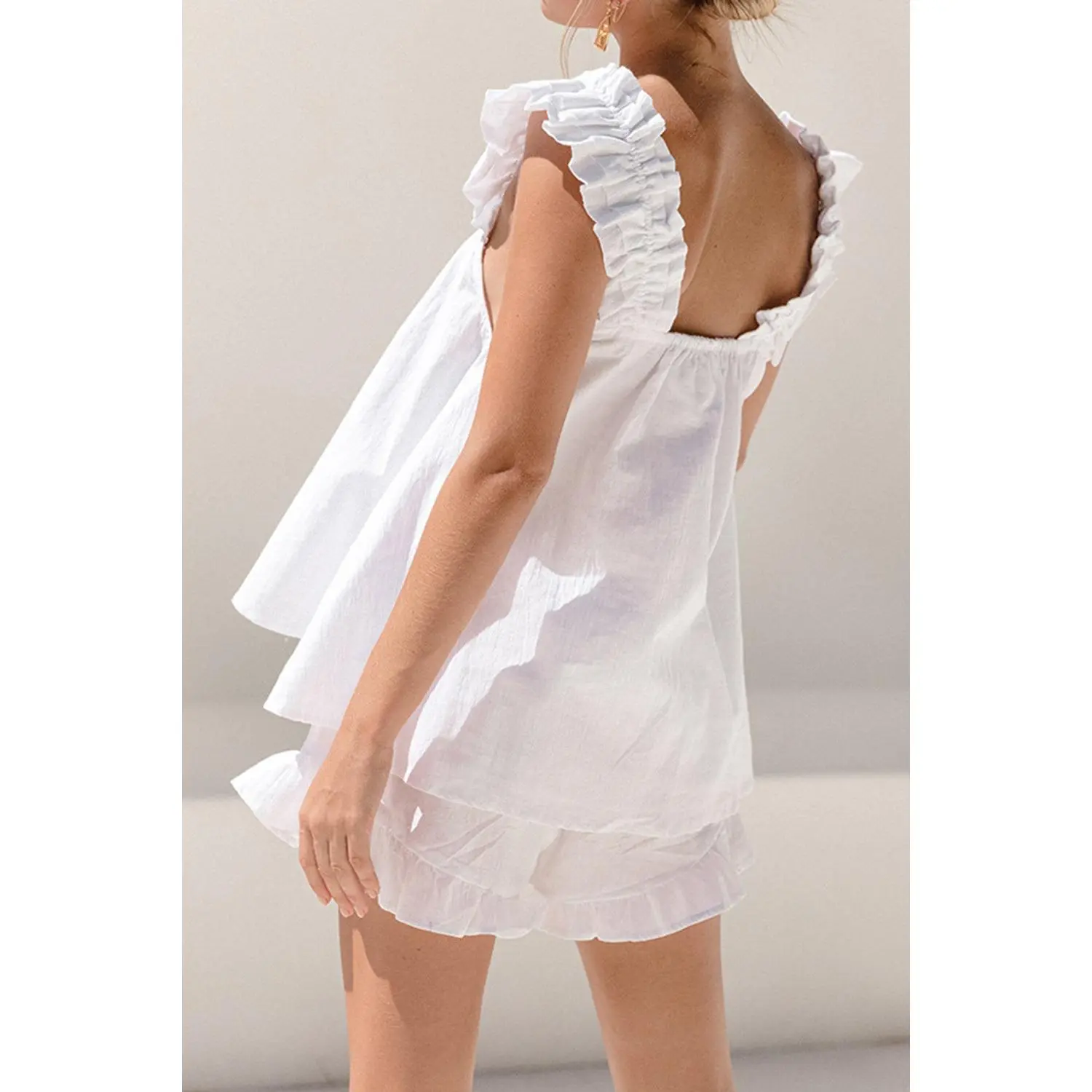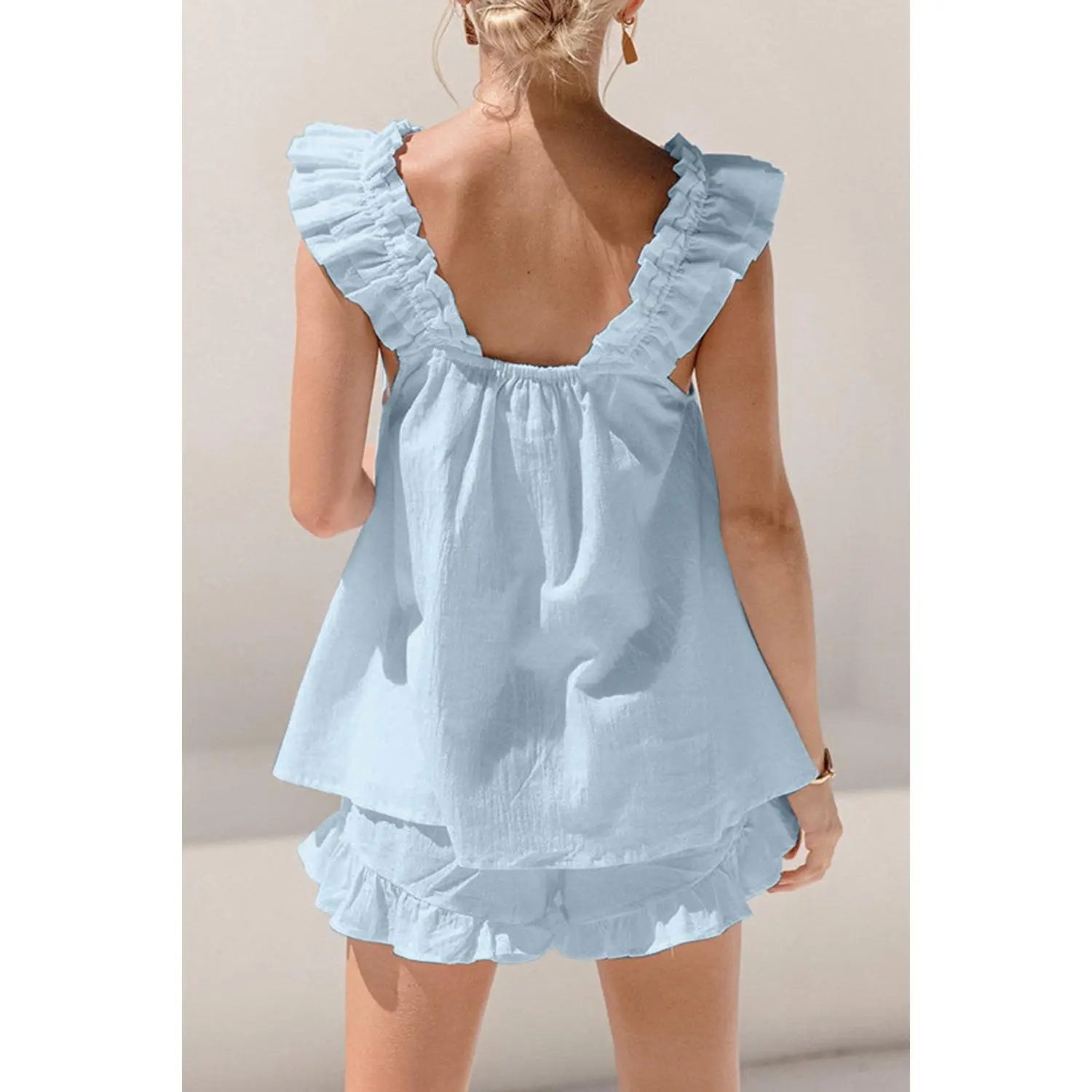 Women's Solid Ruffle Trim Blouse & Shorts Two-Piece Set, Casual Bishop Sleeve Long Sleeve Top & Shorts for Daily Wear, Ladies Two-piece Outfits for Summer