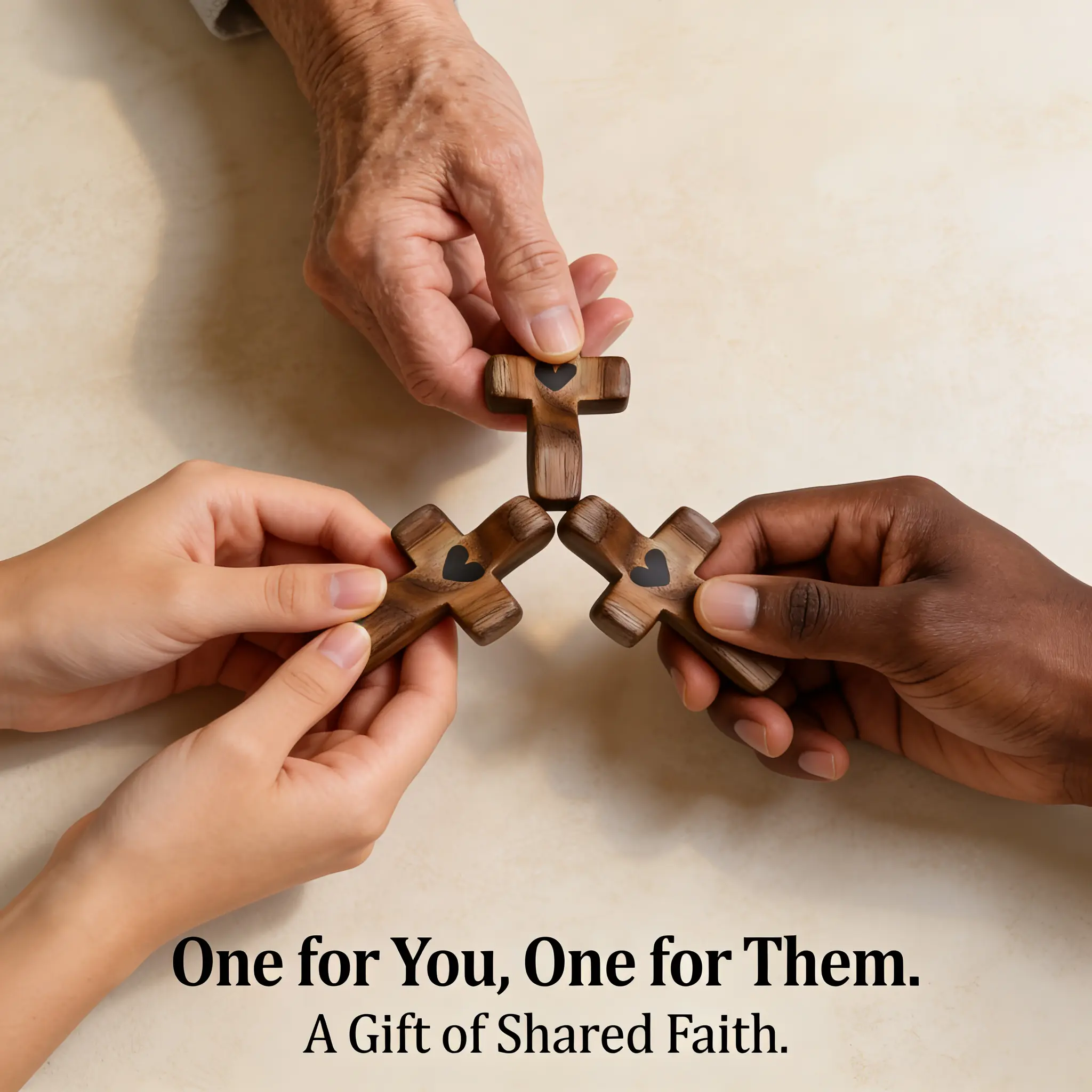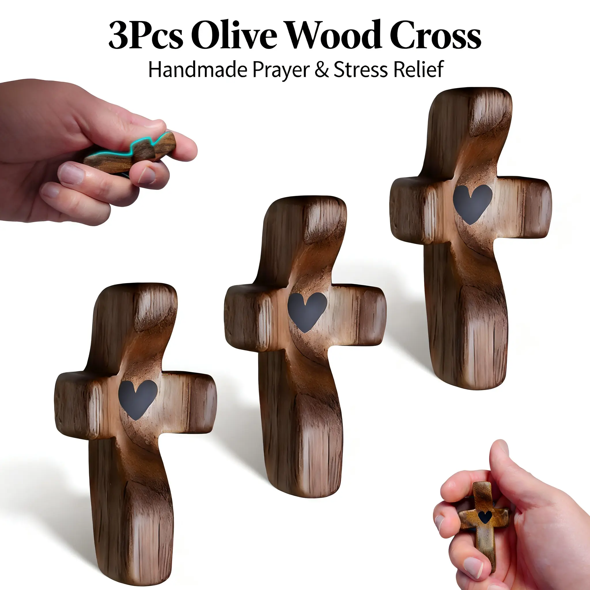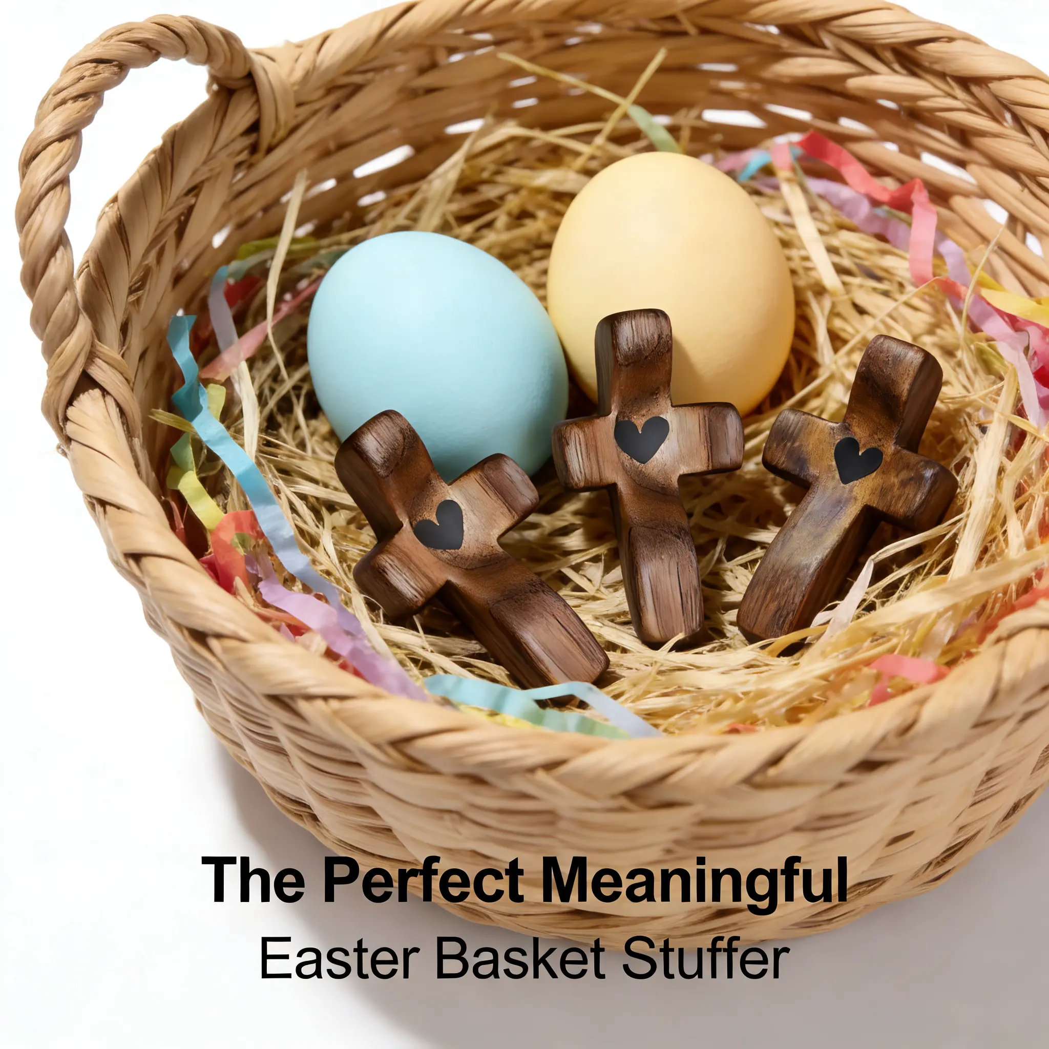 Celebrate the season of renewal with this set of 3 handmade olive wood holding crosses. Featuring a unique black heart inlay, these crosses serve as a powerful symbol of faith, love, and hope. Perfect as Easter basket stuffers, baptism gifts, or a thoughtful gesture for church groups and family gatherings.