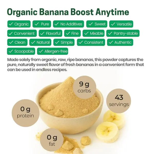 ·Versatile Superfood Powder: Our natural fruit powder can be used in juice, smoothies, dry fruit preparations, powdered drinks, cake mixes, and more. Reconstitute it with water, and it's a perfect substitute for mashed bananas in your recipes.
