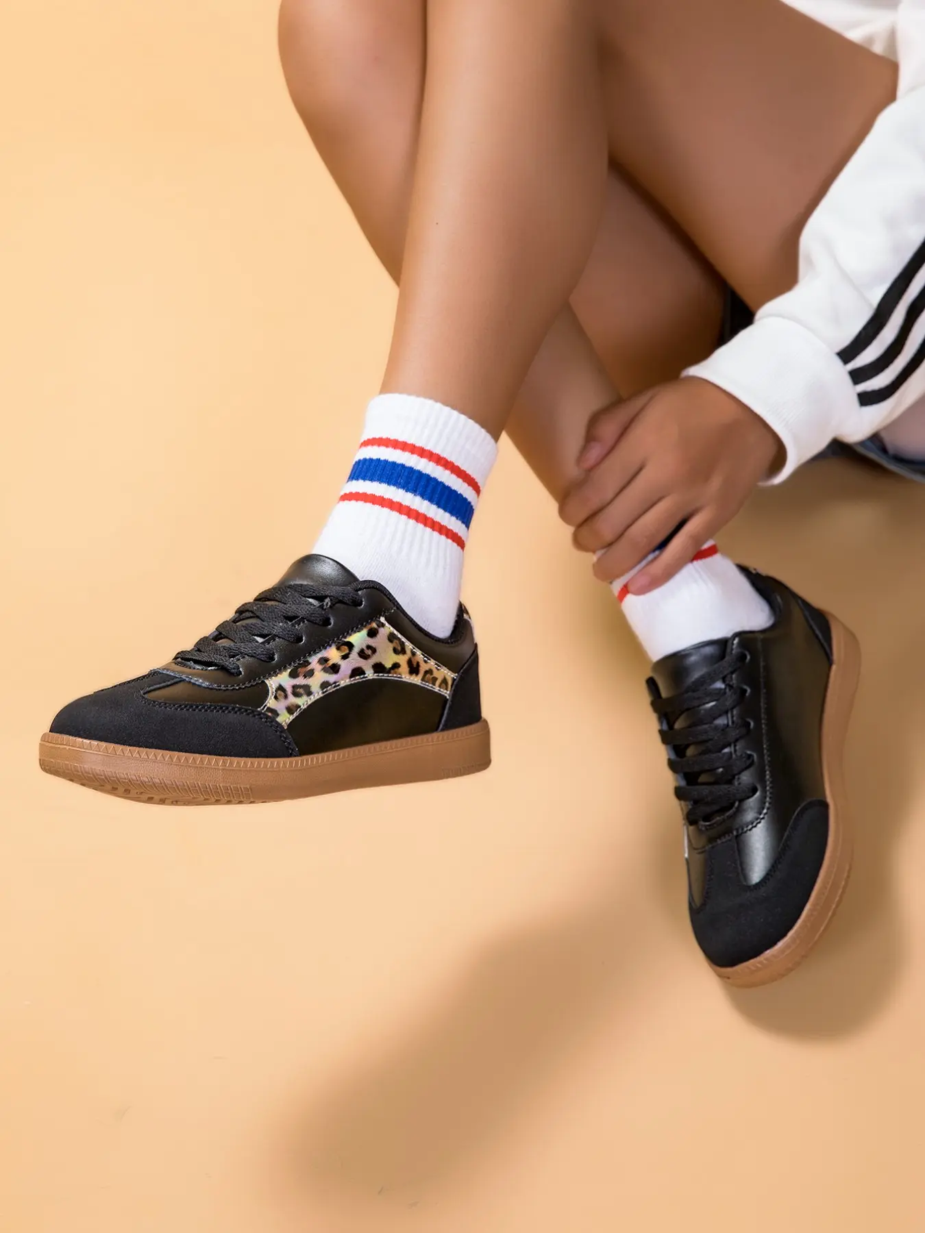 Dn. Monkeys Unisex Retro Leopard Print Sneakers, Laser Cut Patchwork Design, Casual Low Top PU Leather Shoes, All Seasons Comfort