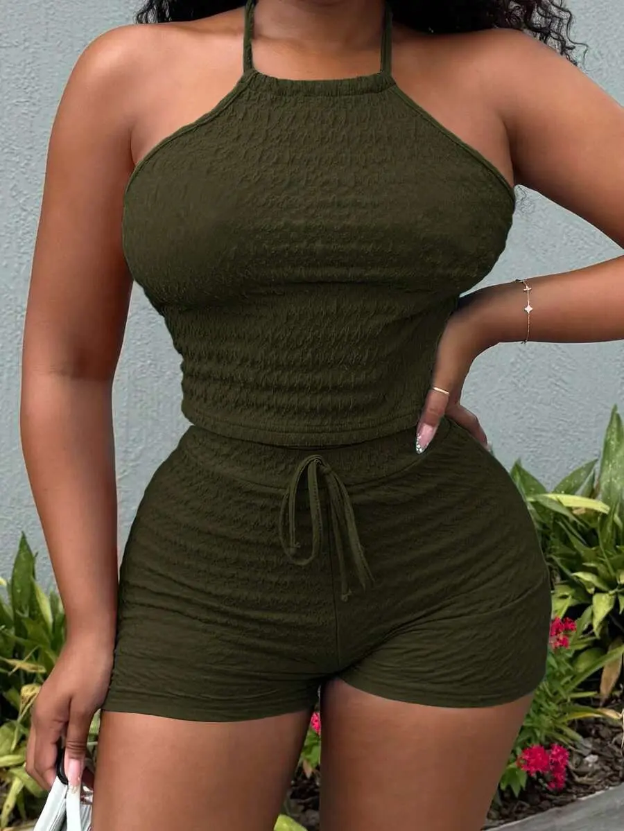 YULENA 2pcs Vacation Casual Striped Knit Texture Metal Buckle Spaghetti Strap Camisole And Shorts Set, Suitable For Party