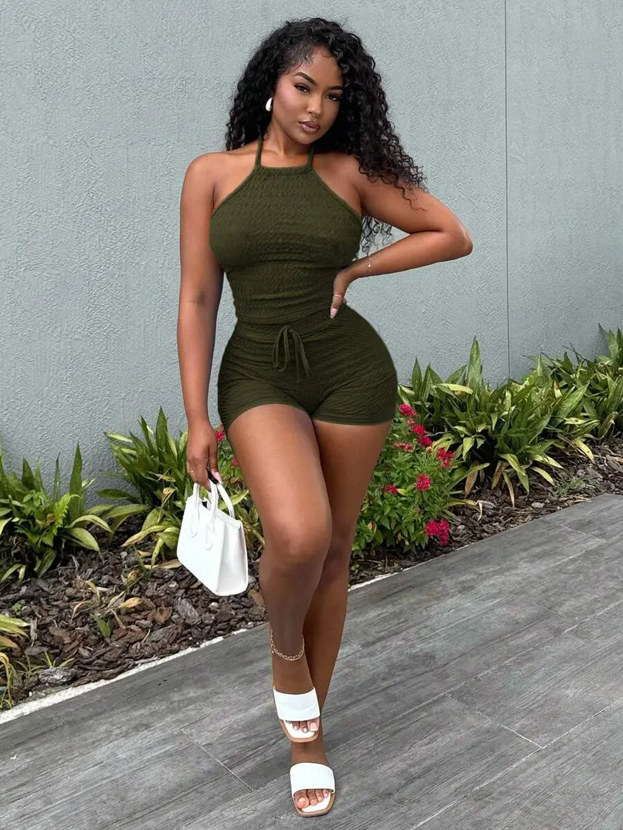 YULENA Women's Summer Solid Backless Tie Up Camisole Top And Body-Hugging Mini Skirt Set ,2 Piece Sets