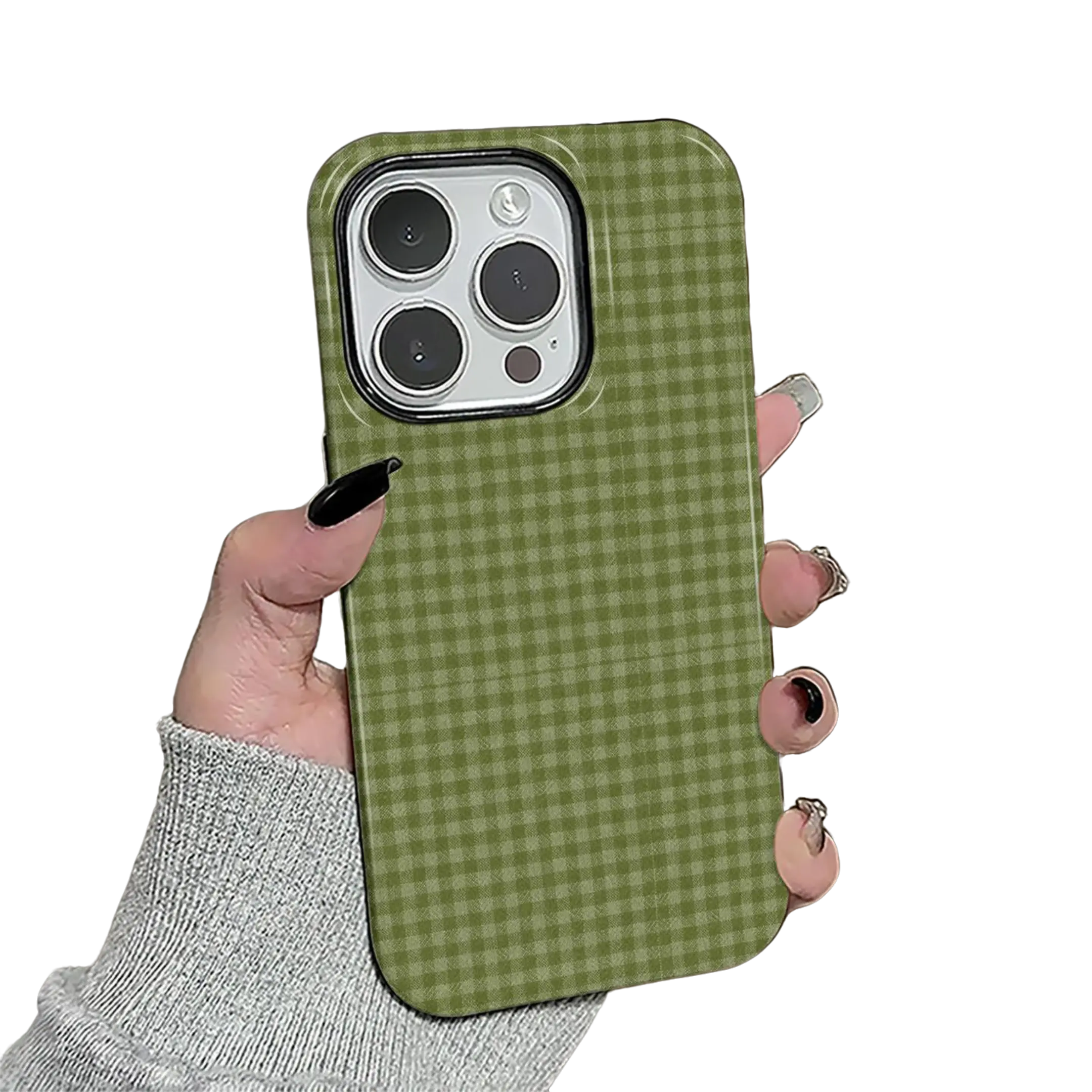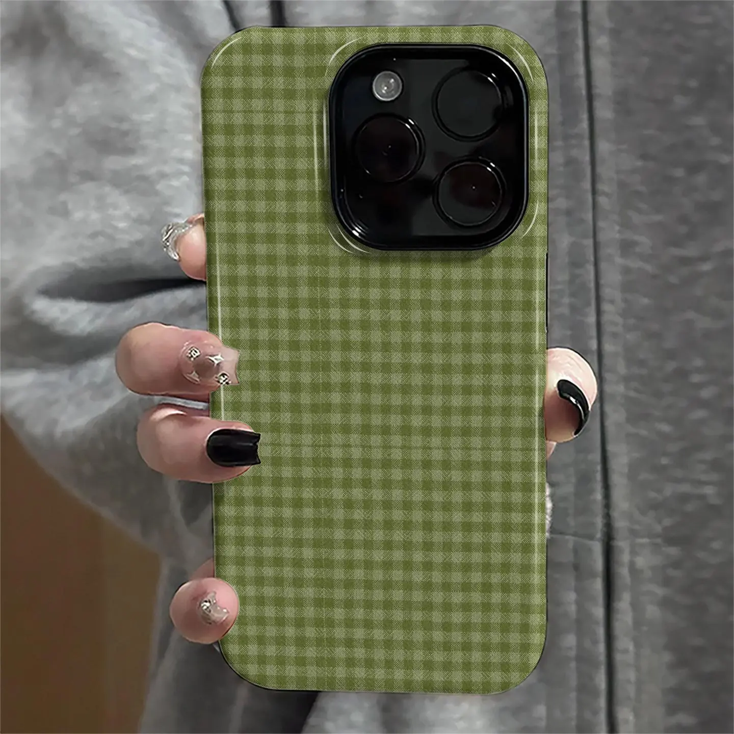 Fresh and simple style, green striped design, checkered pattern phone case, suitable for iPhone 11, 12, 13, 14, 15, 16, 17 Pro Max and Samsung Galaxy S25 Ultra, S24 Plus, S23 FE, S22, S21. New 2-in-1 shockproof design. MFL51