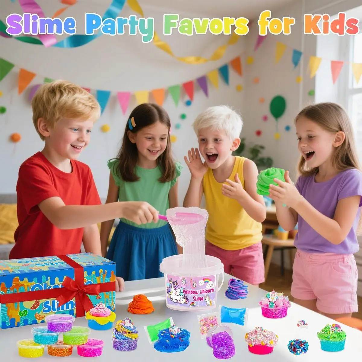 【Easy Storage Container】This rainbow slime kit comes in 10 storage jars. When not playing, put the slime back into the bucket or jars and cover them tightly in case of drying.
