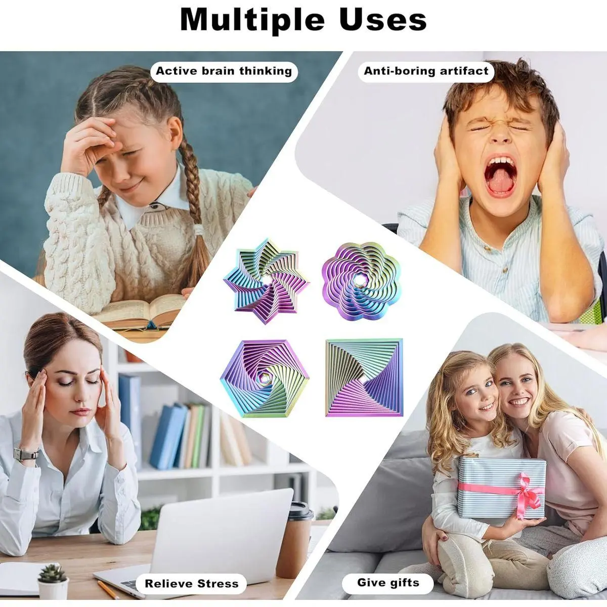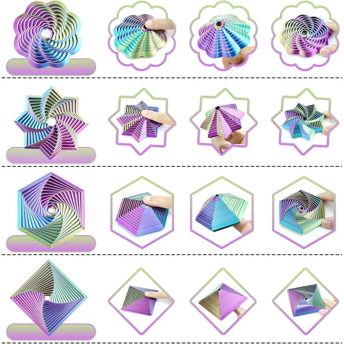 Unique Geometric Shapes: Includes four eye-catching designs—a hexagon, an octagon star, a flower-like spiral, and a square. Each features vibrant, dual-color 3D patterns that create a mesmerizing visual effect, making them perfect for sensory stimulation and desk decor.