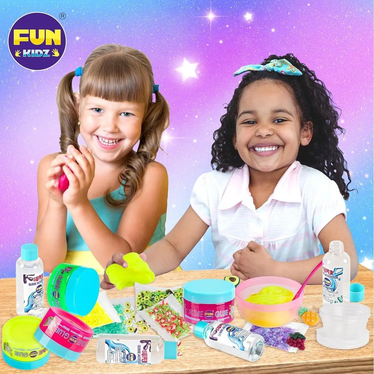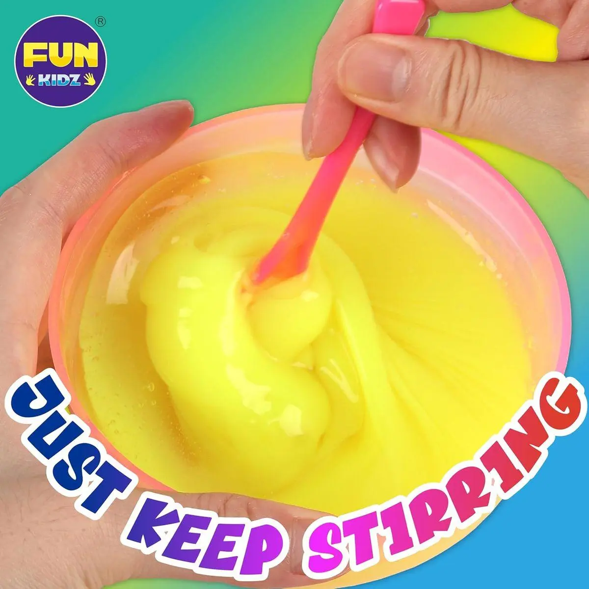 [FRUIT SLIME MAKING]- FUN KIDZ neon glue slime kit includes 4 bottles scented neon glue, 4 bottles slime activator, 4 fruit charms, 4 bags fruit sparkles, 4 bags sugar paper, storage cups, mixing bowl and spoon. More than enough slime supplies to make neon slime, fruit slime, candy slime and sweet slime. Bring littles hours fun experience.
