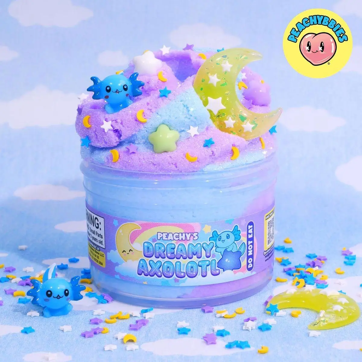 DREAMY CLOUD DOUGH TEXTURE SLIME: Each 7 oz. reusable jar is packed with soft, fluffy purple cloud dough scented with a sweet and tart aroma. It’s topped with a dreamy sky of pastel charms—featuring an adorable axolotl, glittery crescent moon, rainbow fimos, stars, clouds, and mini shapes for a fun, squishy texture. This pre made, mess free, non sticky slime is perfect for stress relief or magical play anytime, anywhere.