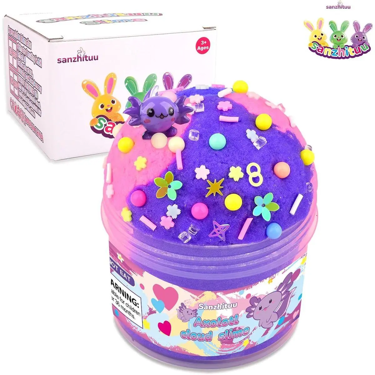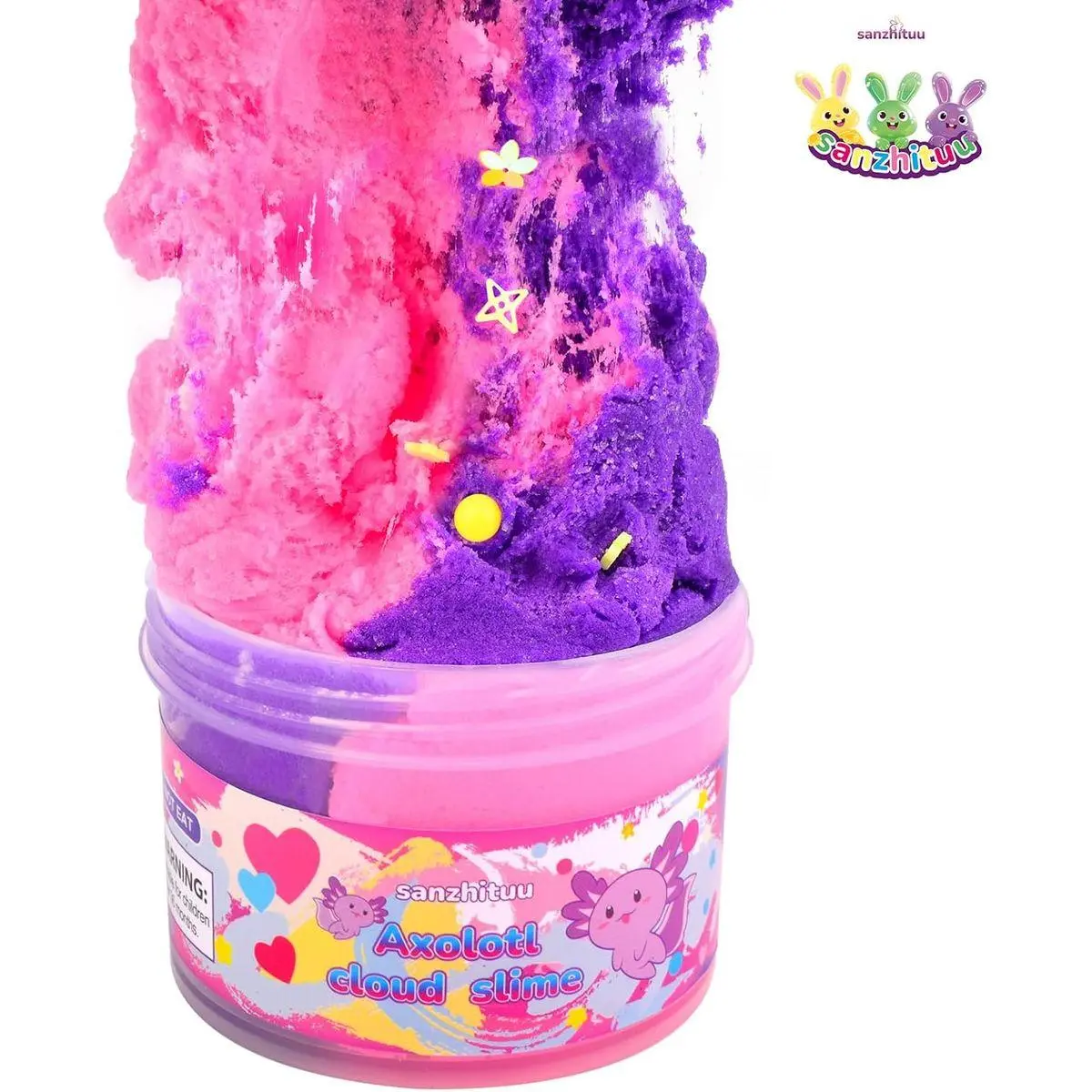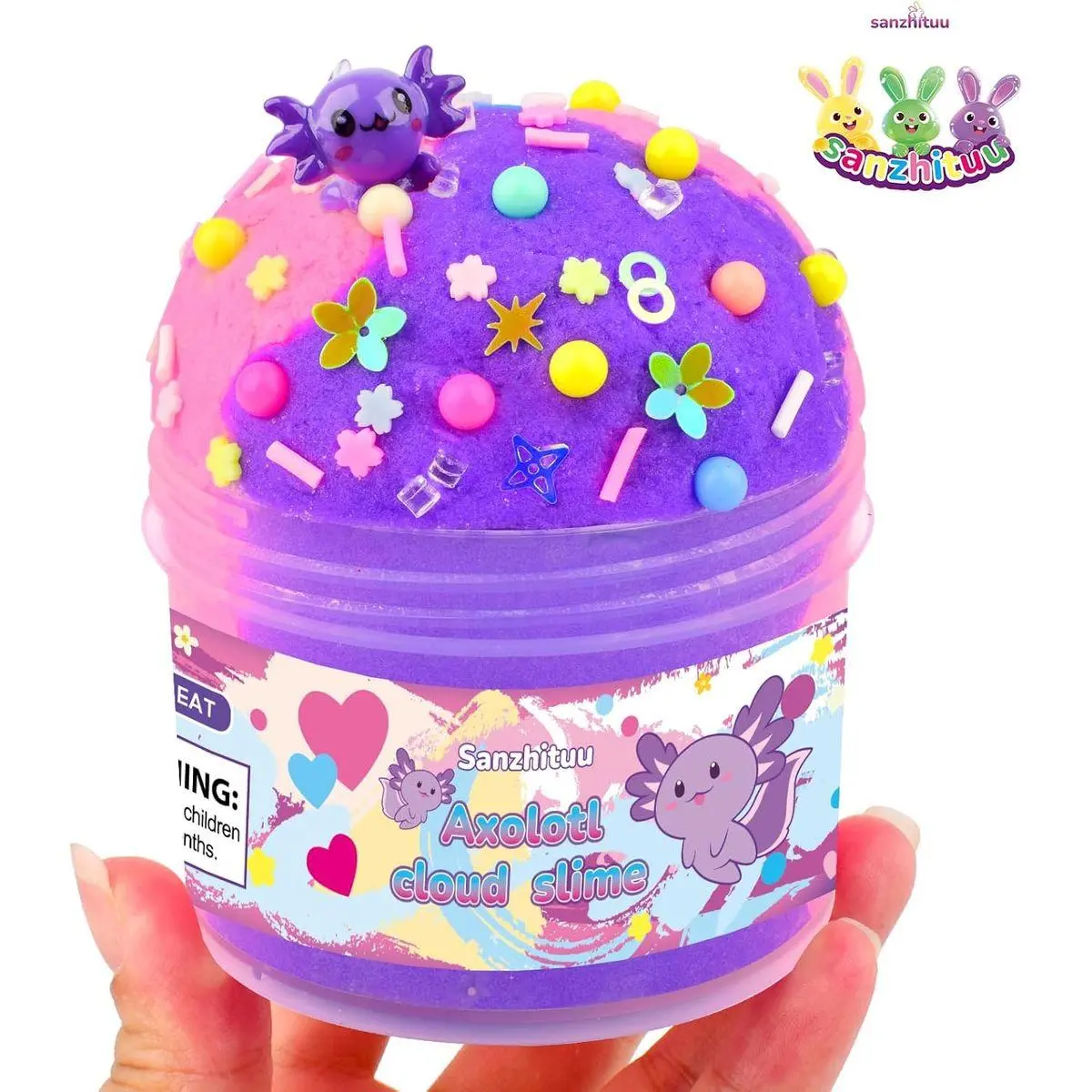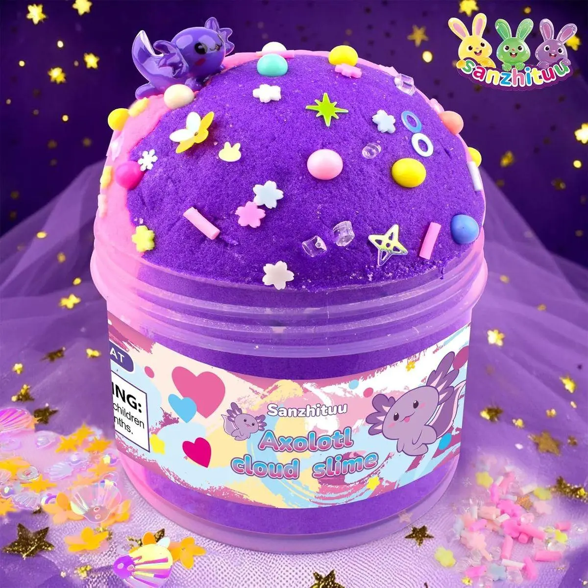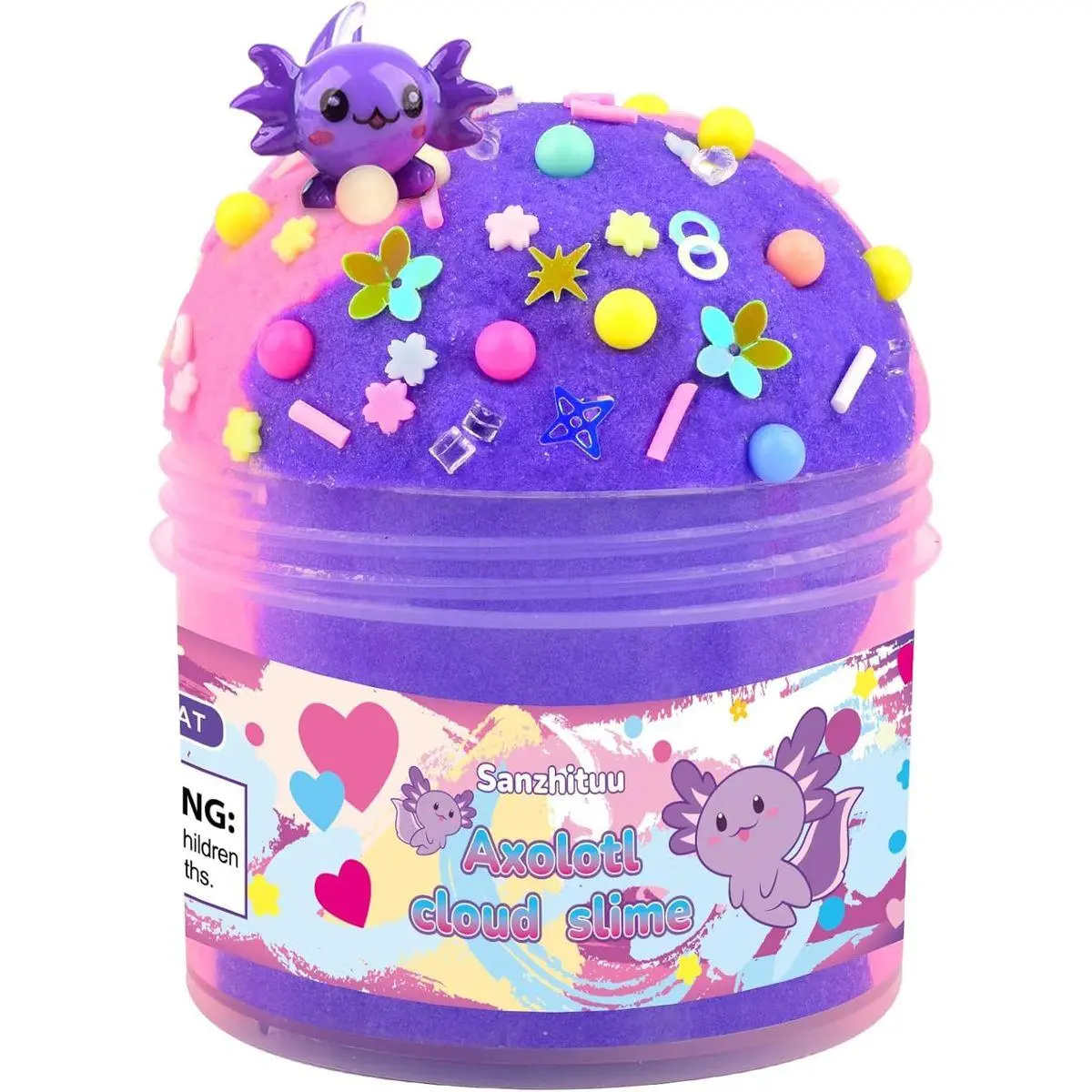 Large 7oz Axolotl Slime Jar – Our cloud slime kit comes in a generous 200ml jar, featuring purple slime and pink slime with a cute axolotl toy and colorful decorations. Perfect choice for slime mart fans, collectors of cute stuff, and kids who love sensory play