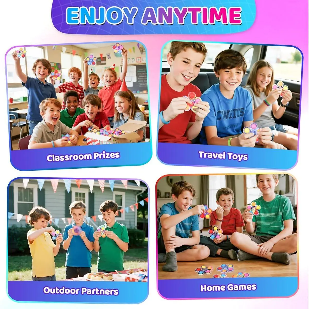 2-in-1 Sensory Pop Fidget Spinner Bulk: Each fidget spinner features soft silicone pop bubbles that make a satisfying "pop" sound when pressed, delivering tactile stimulation and sensory relief. With 9 vibrant tie-dye designs, this colorful set sparks visual interest and stands out from the crowd—there’s a favorite for everyone