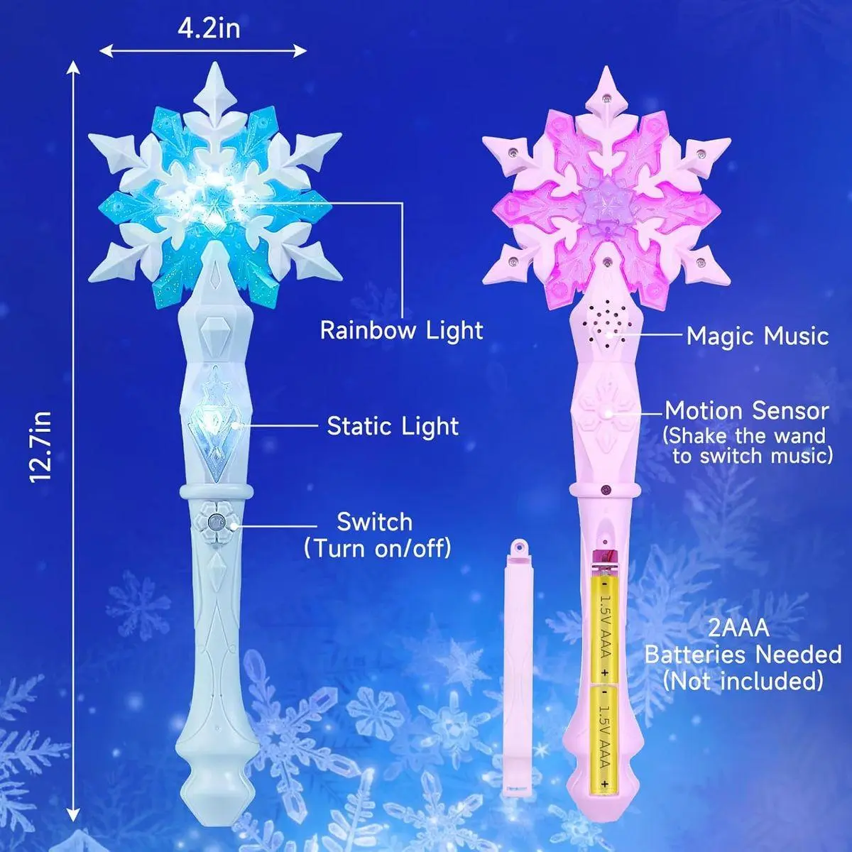 RAINBOW LED LIGHTS - Press the switch to activate bright gradient LEDs. The glowing snowflake cycles through multiple colors, making this light-up wand shine beautifully day or night