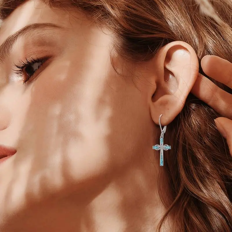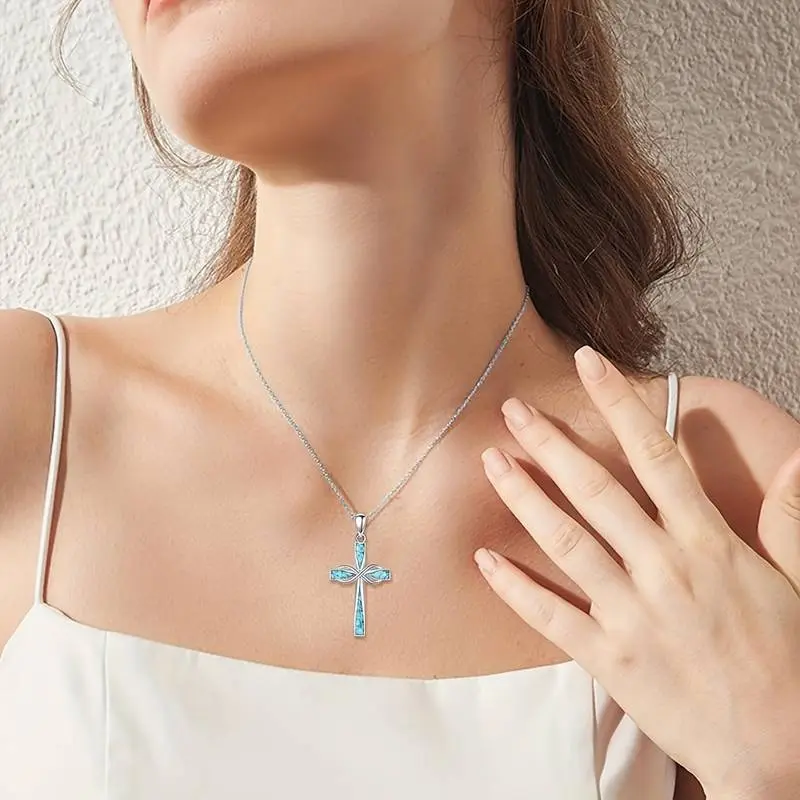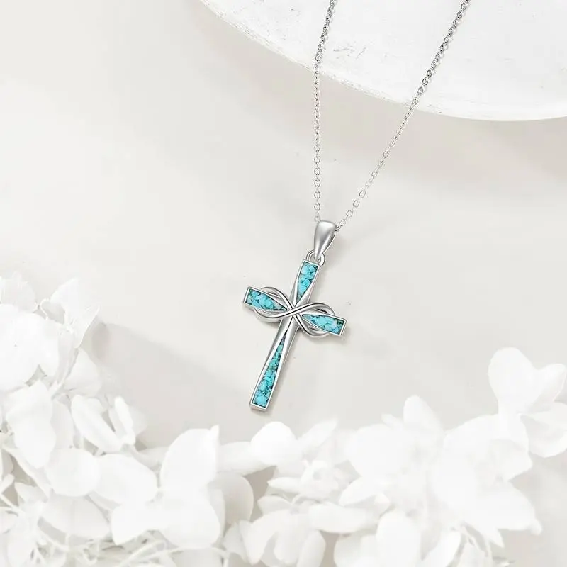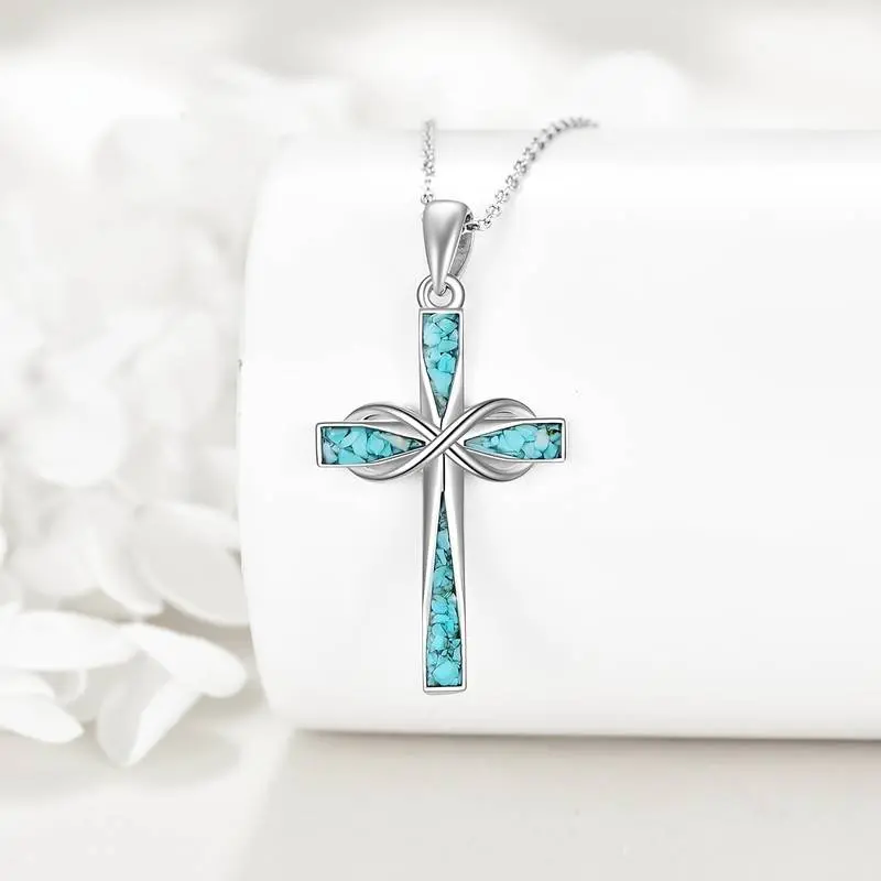 This set includes a necklace and earrings, perfect for women. The turquoise cross pendant features an infinite symbol, adding a touch of religious significance. Ideal for holidays or birthdays, it makes a thoughtful gift for friends. The set combines style with meaning, making it a versatile accessory.