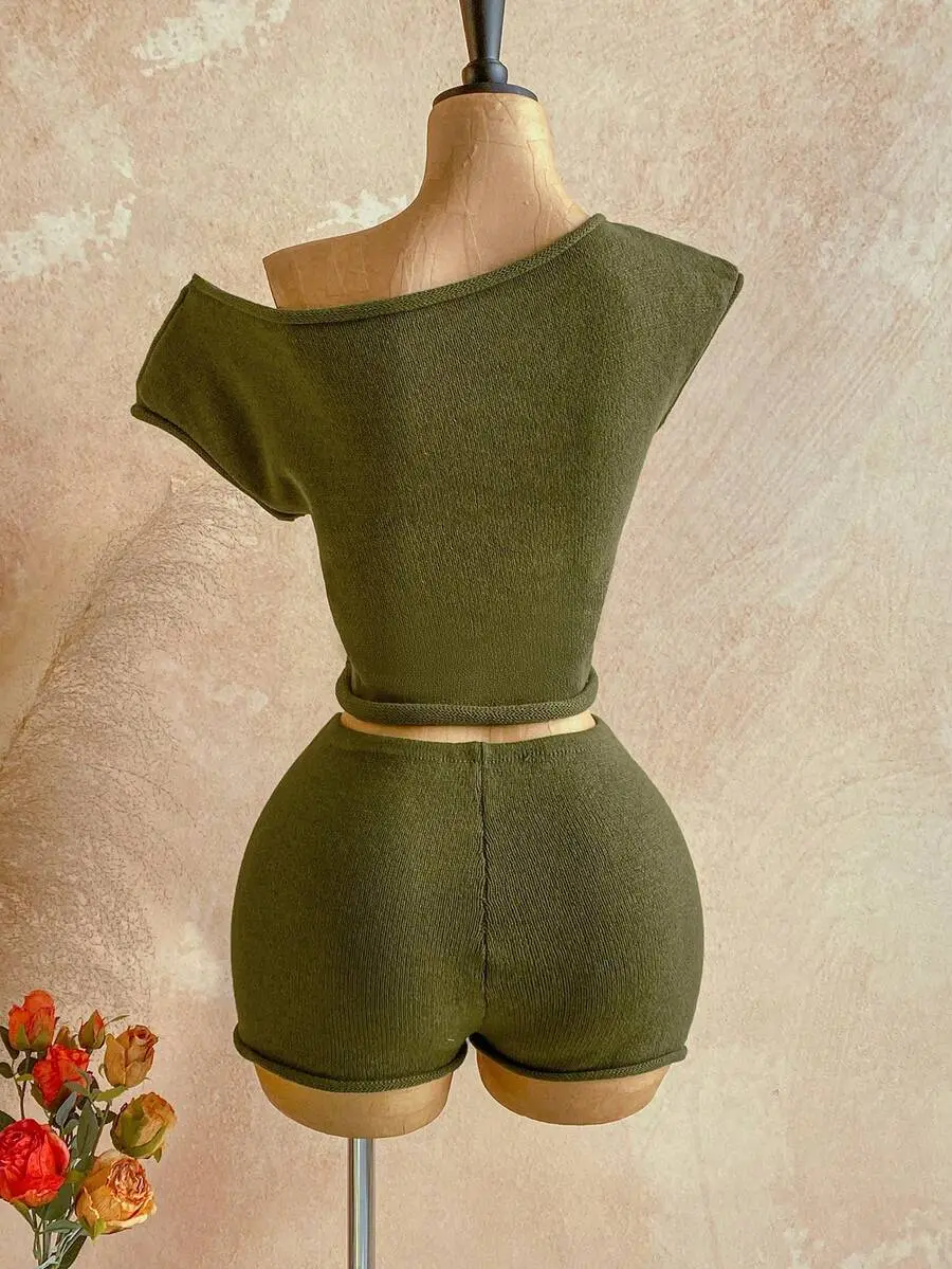YULENA 2pcs/Set Women Solid Color Round Neck Short Sleeve Slim Fit T-Shirt And Shorts, Casual