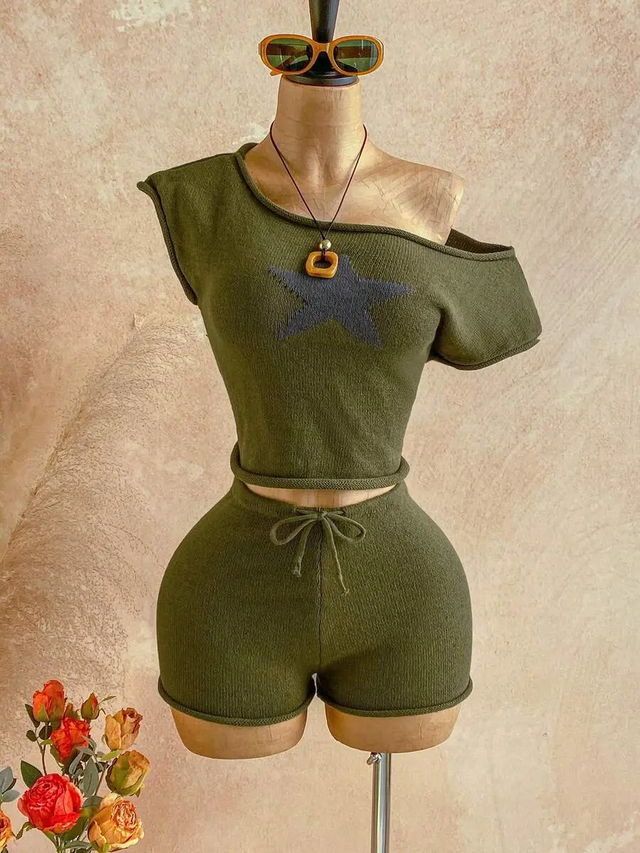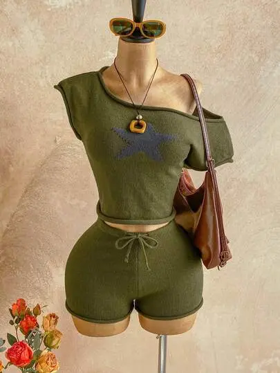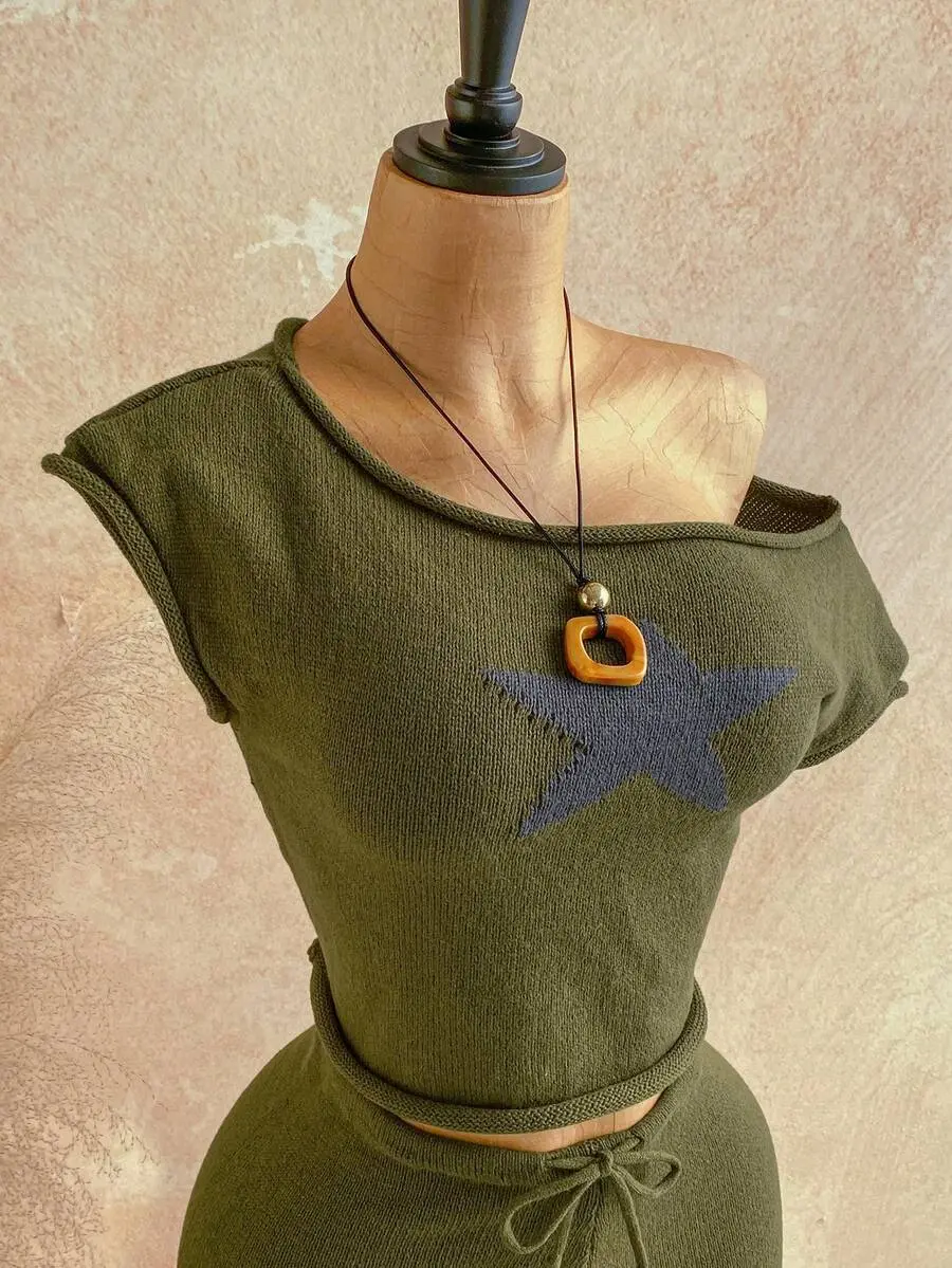 YULENA Pentagram Jacquard Oblique Strap Tunic Drawstring Waistband Pair Preppy Look