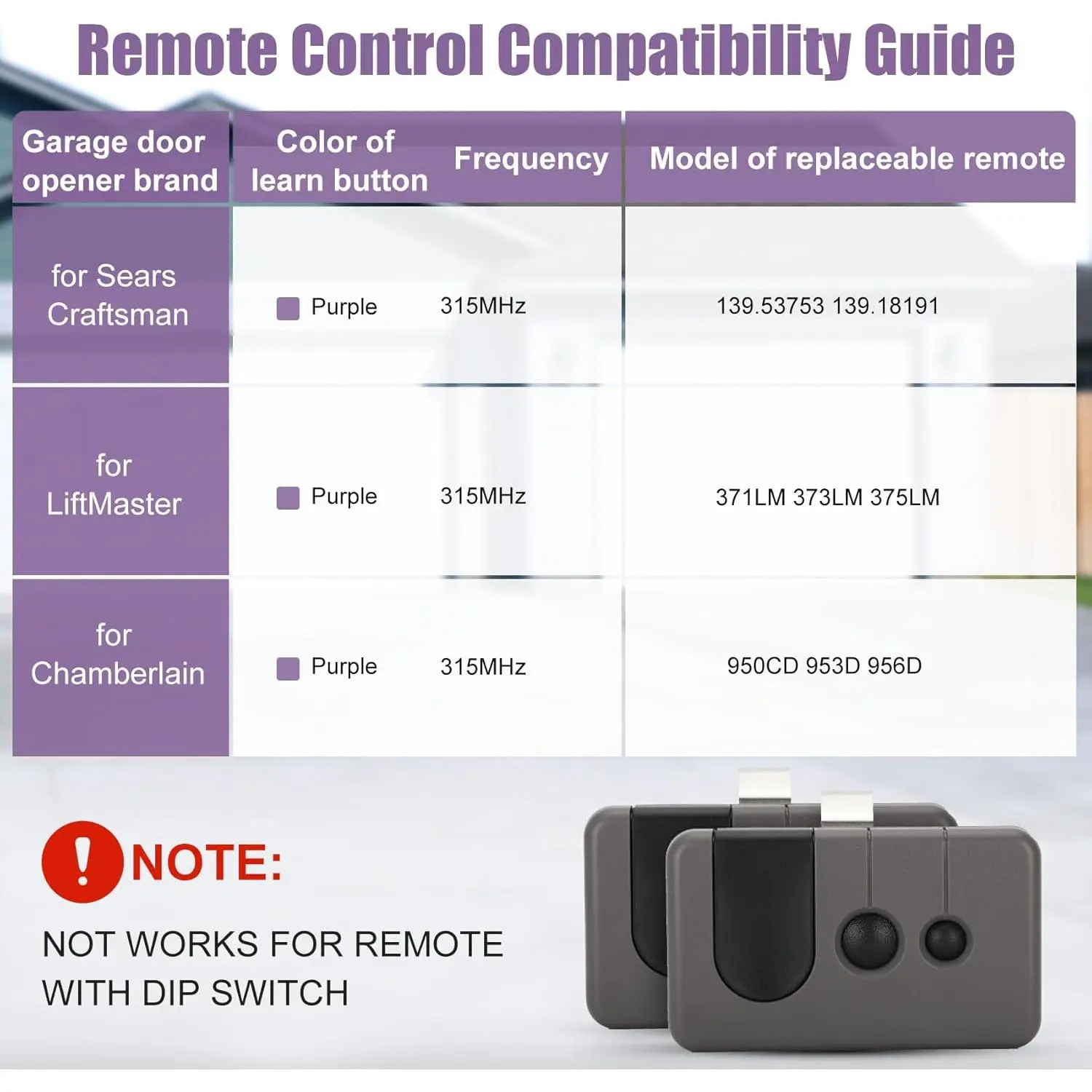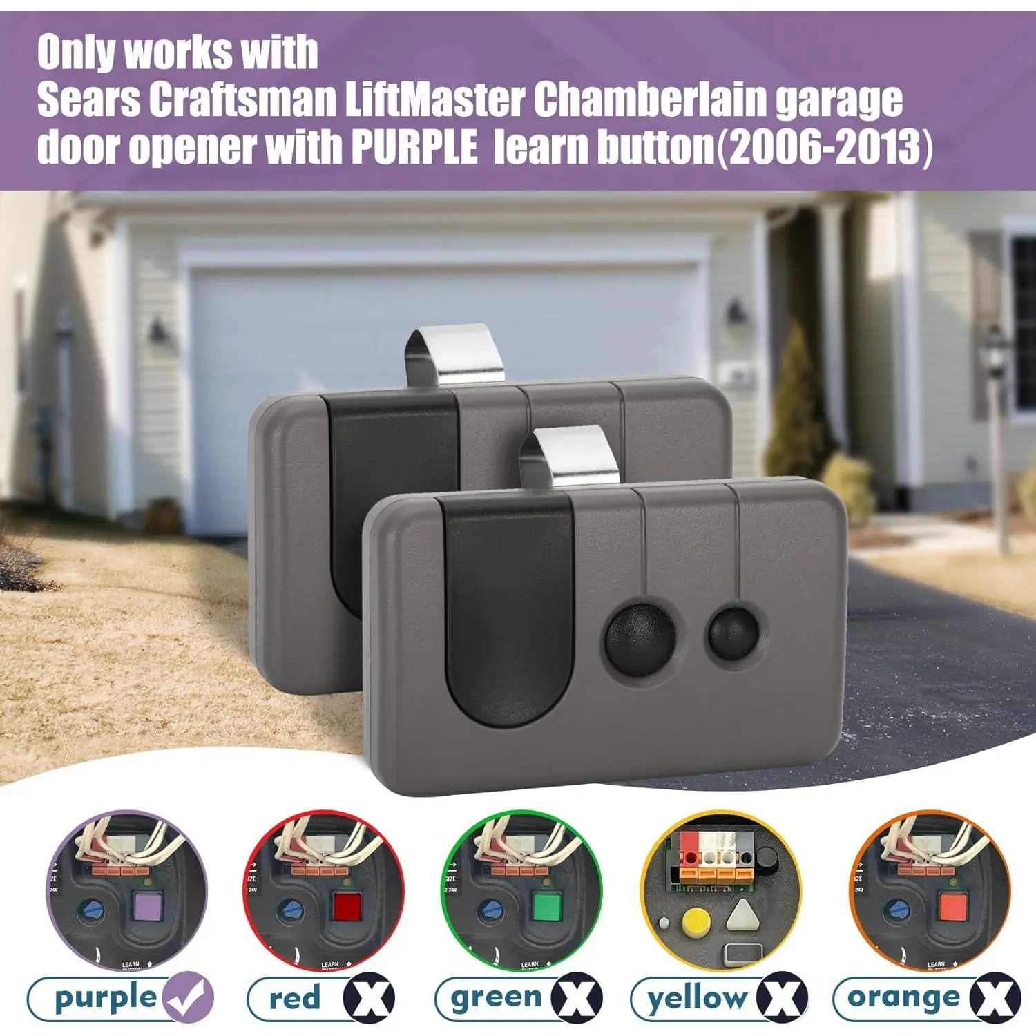 [Adaptability]:for Craftsman/LiftMaster/Chamberlain garage door opener manufactured from 2006-2013, Can ONLY work with PURPLE learn button (check the back of your opener).Code type: Security+ 315 MHz, Please refer to the model list on the A+page for the applicable models.