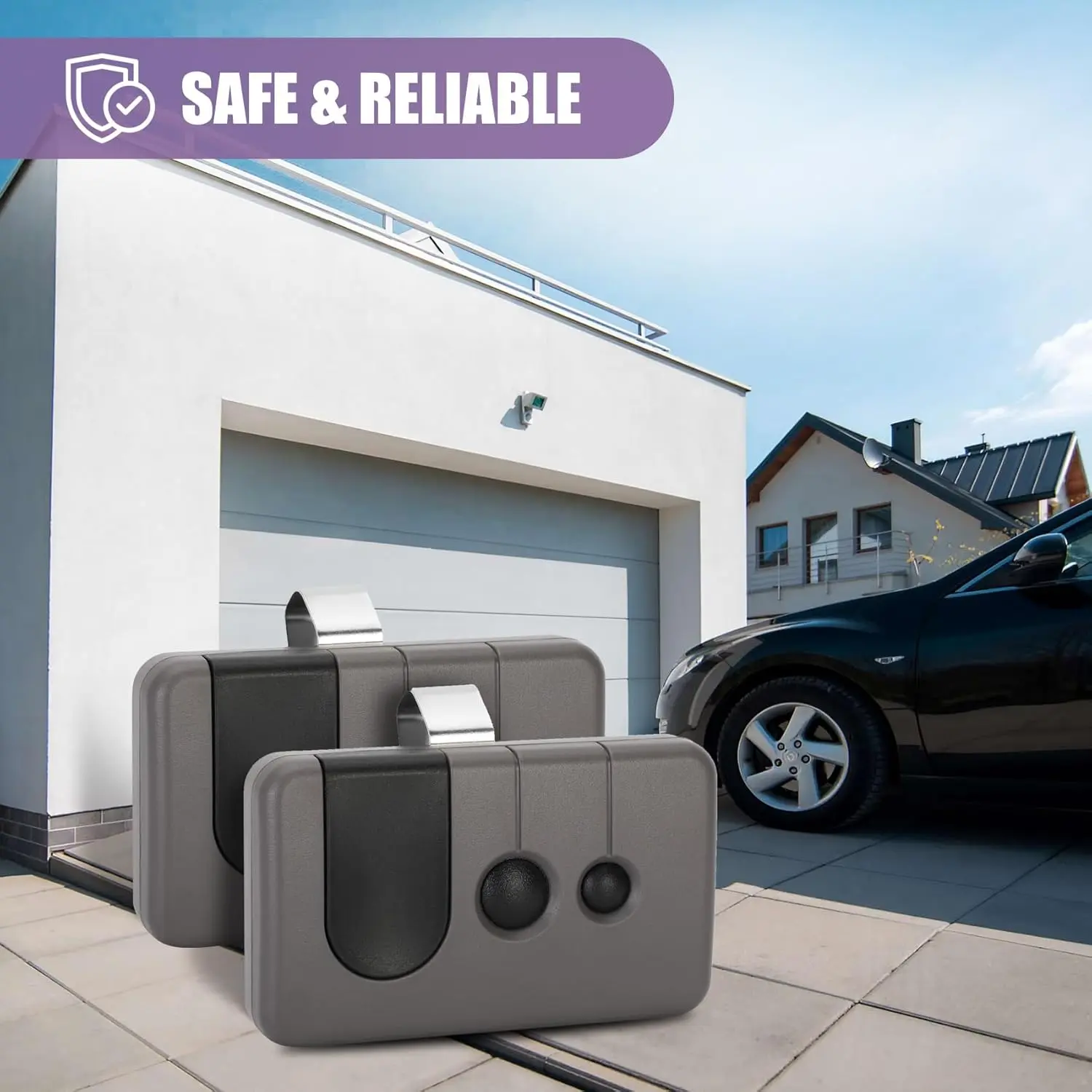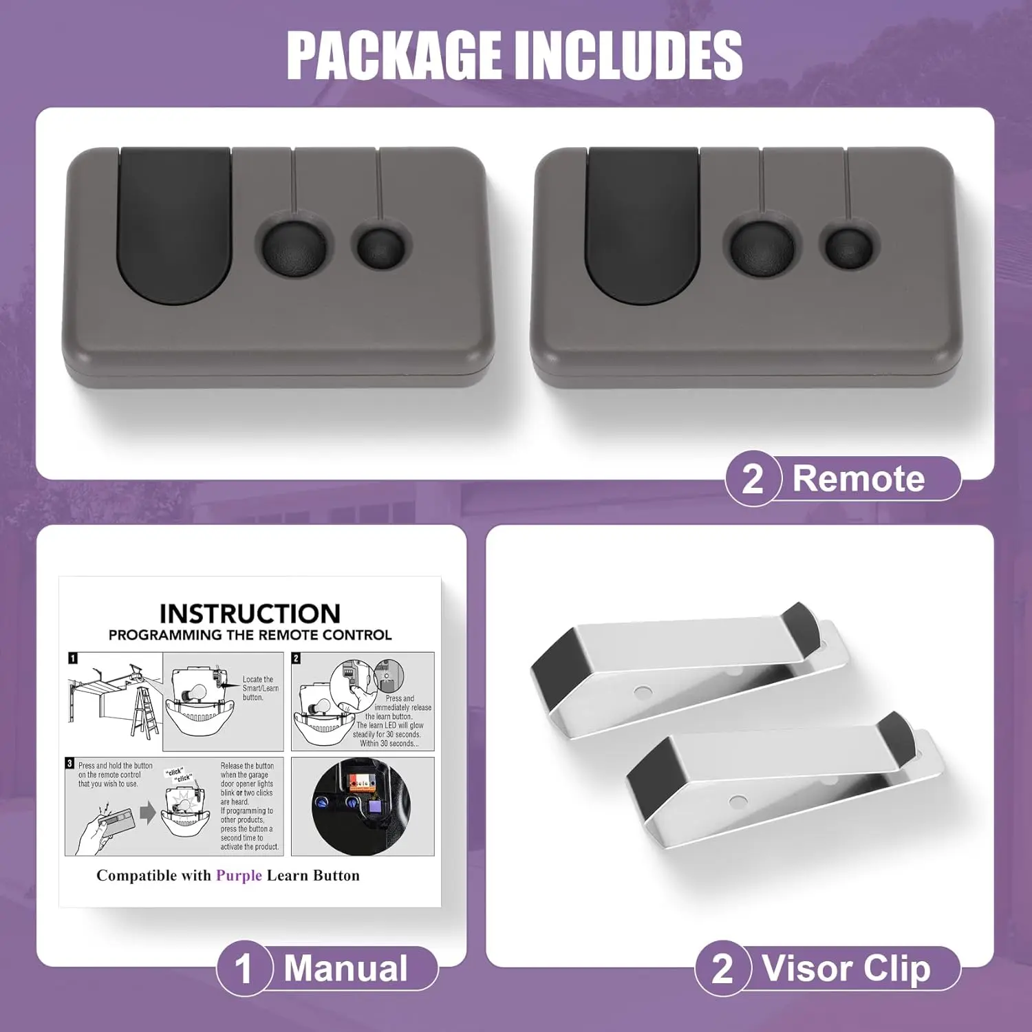 [Small and Convenient]: Package includes garage door opener remote * 2, sunshade clip * 2, manual * 2.Each remote come with a visitor clip, so you can easily attach it to your car's visitor and control your garage door while driving.