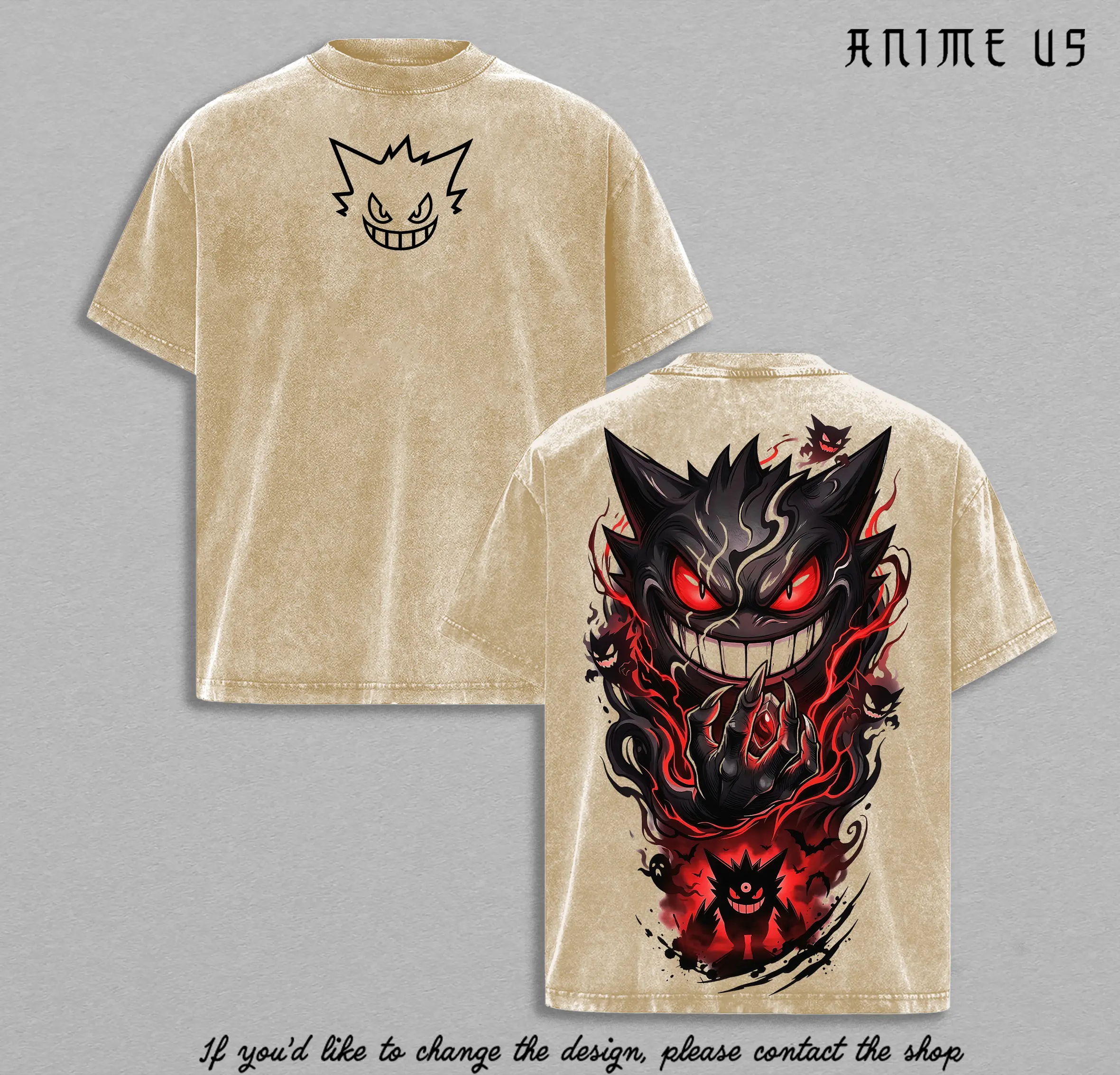 5. Gengar PKM Vintage Washed Oversized Anime Shirt, Evil Grin Shadow Graphic Tee, Red Aura Streetwear, Heavyweight Cotton Unisex Gift
