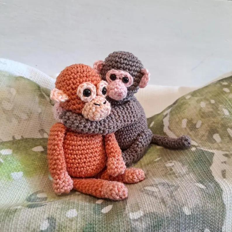 This set includes a pair of handmade monkey plushies. Crafted with care, these amigurumi monkeys are a testament to artisanal skill. The duo is not just a toy but a piece of art. Perfect for gifting or personal enjoyment, these plushies are sure to bring joy.