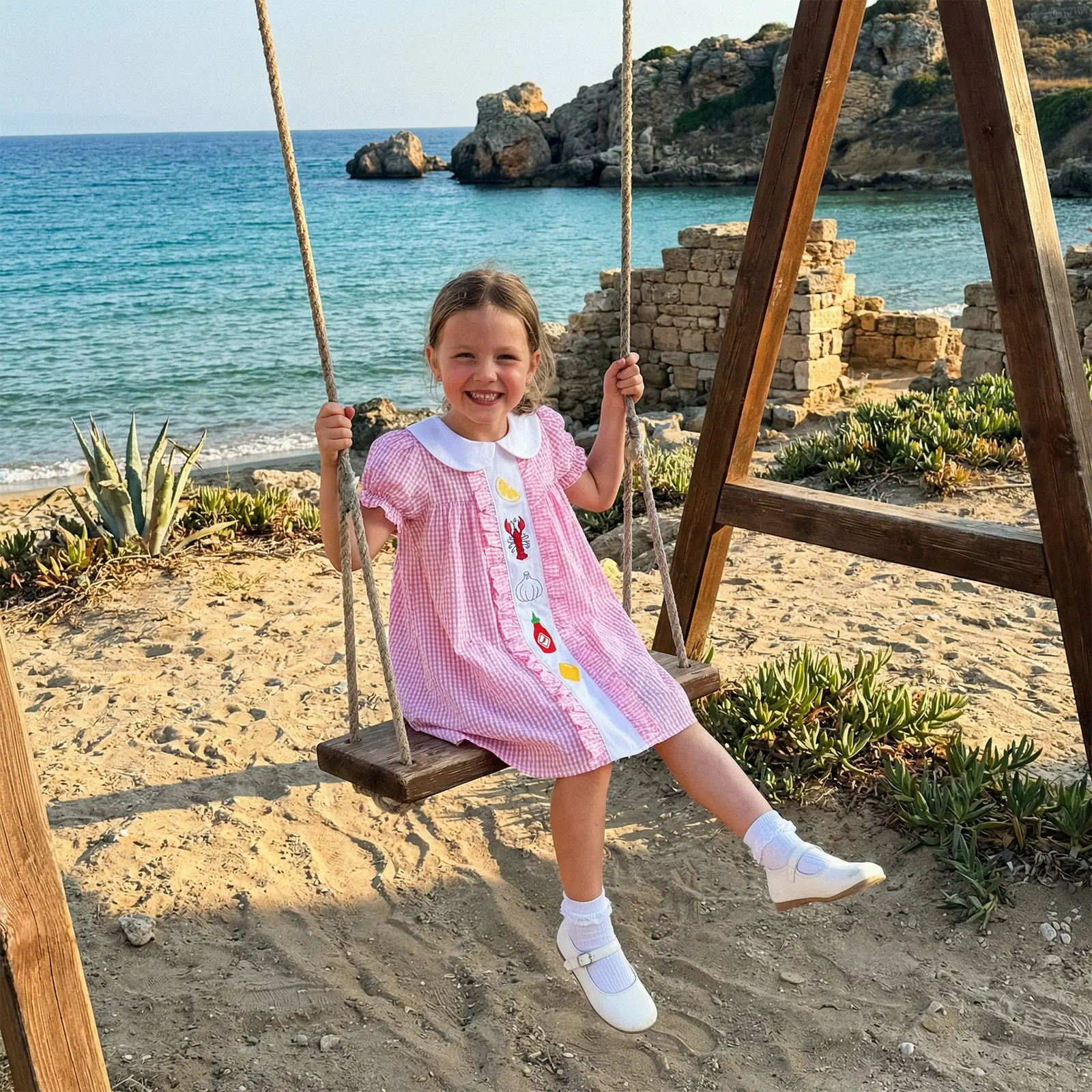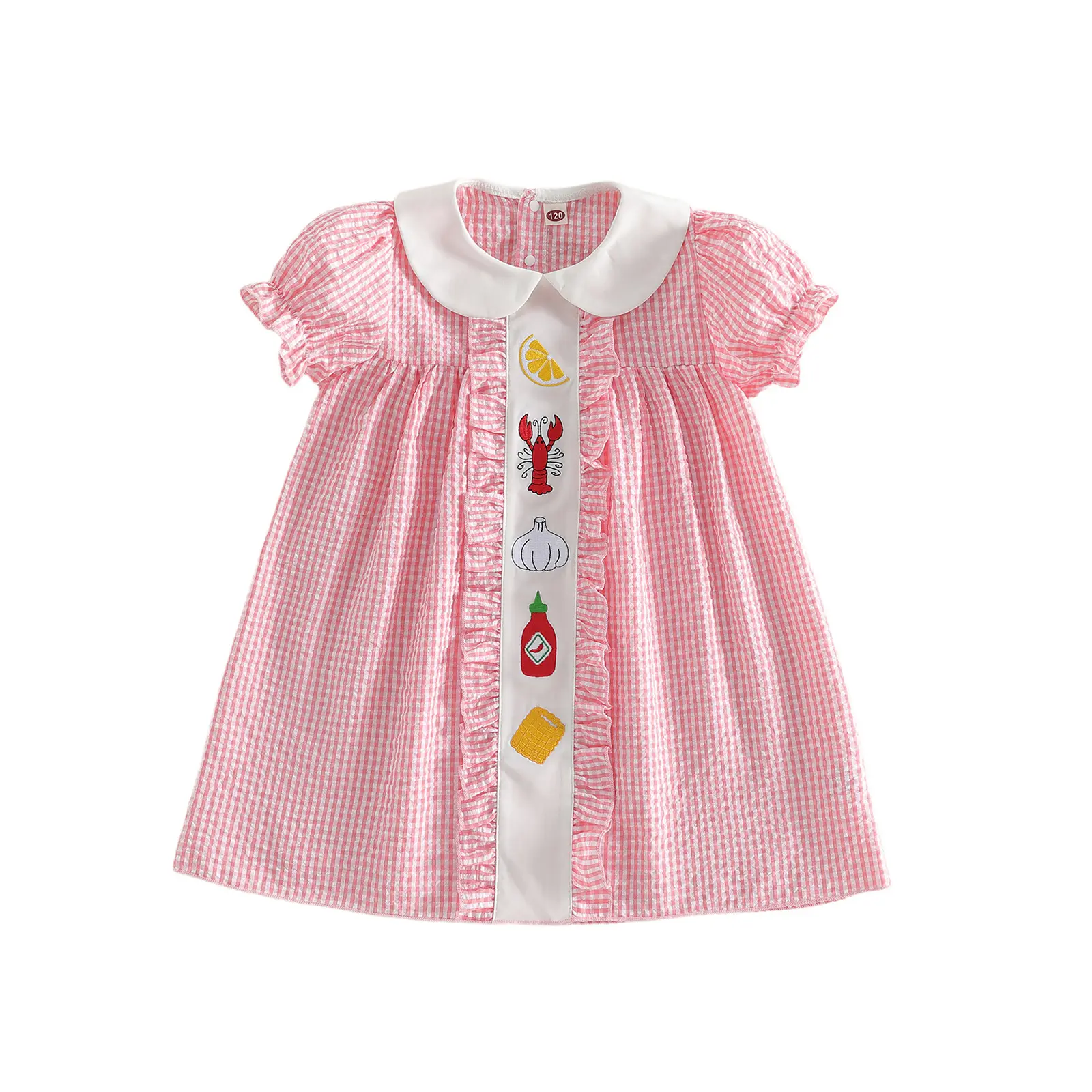·Design: baby girl summer clothes, features exquisite embroidery of Crawfish, Corn, Lemon, Garlic, Hot Sauce. baby girl summer crawfish boil outfit, baby girl checkered dress, features puff short sleeve, peter pan collar, seersucker gingham, The summer dress makes your little girl looks fashionable and sweet