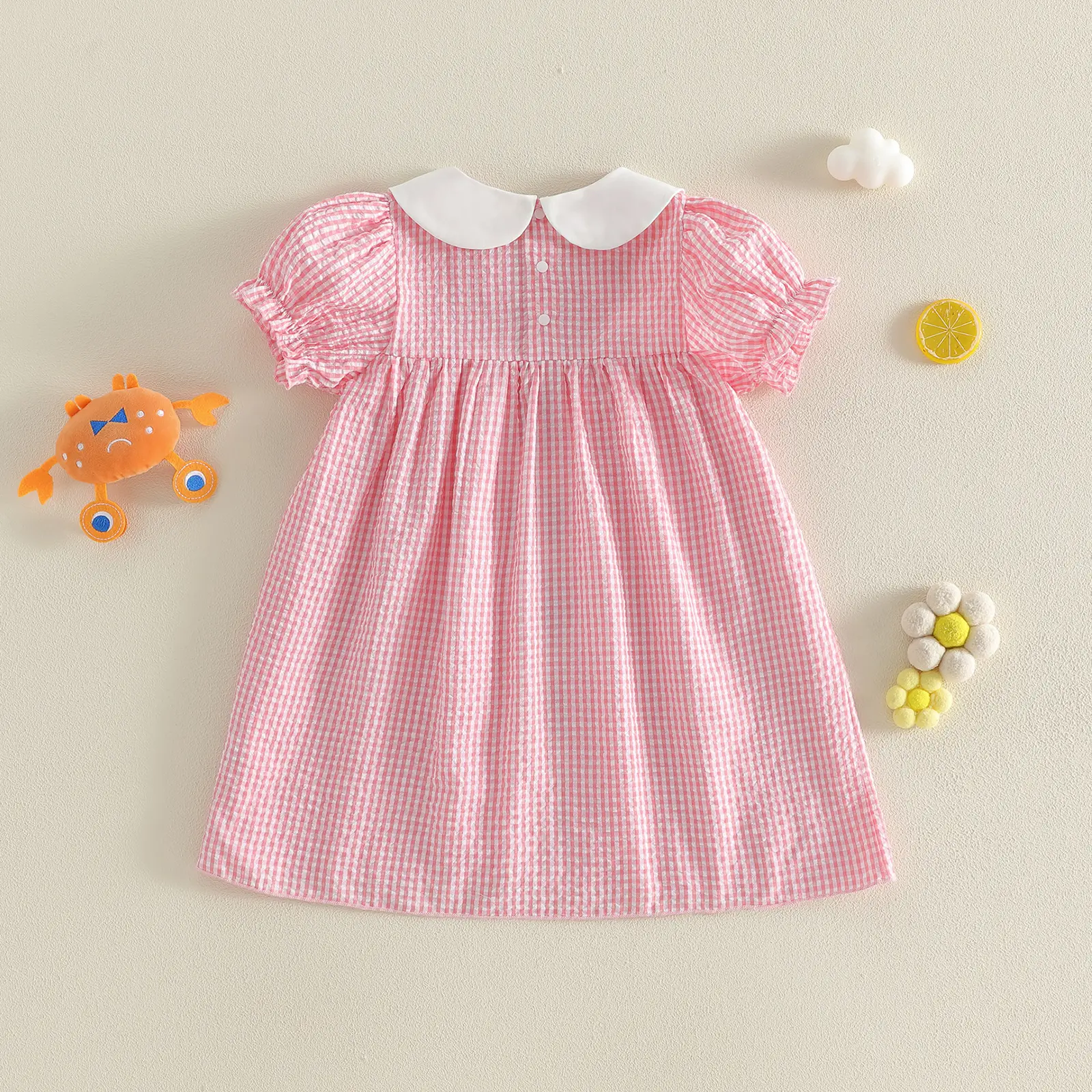 Little Toddler Girl Summer Dress Loose Fit Embroidered Plaid Ruffled Trim Doll Collar Short Sleeve A Line Dress