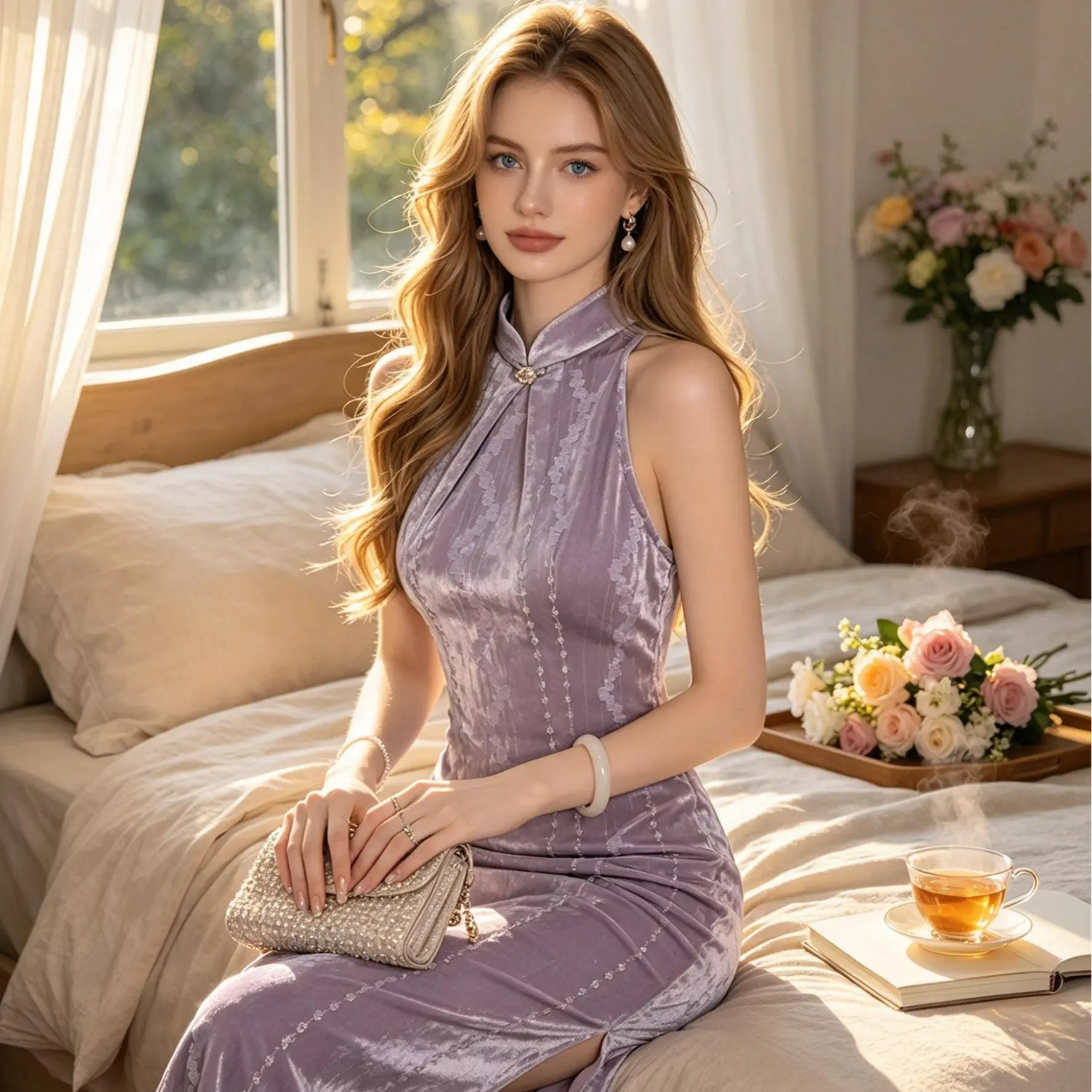 Amethyst Velvet Halter Qipao, Sleeveless Elegant Home & Date New Chinese Dress