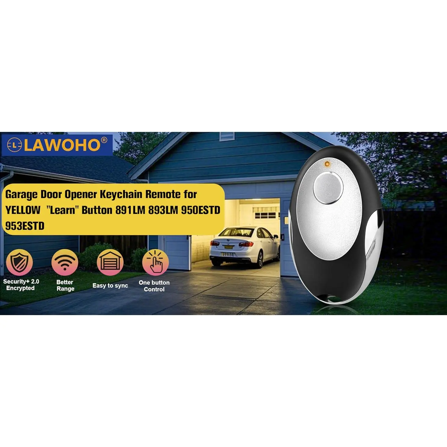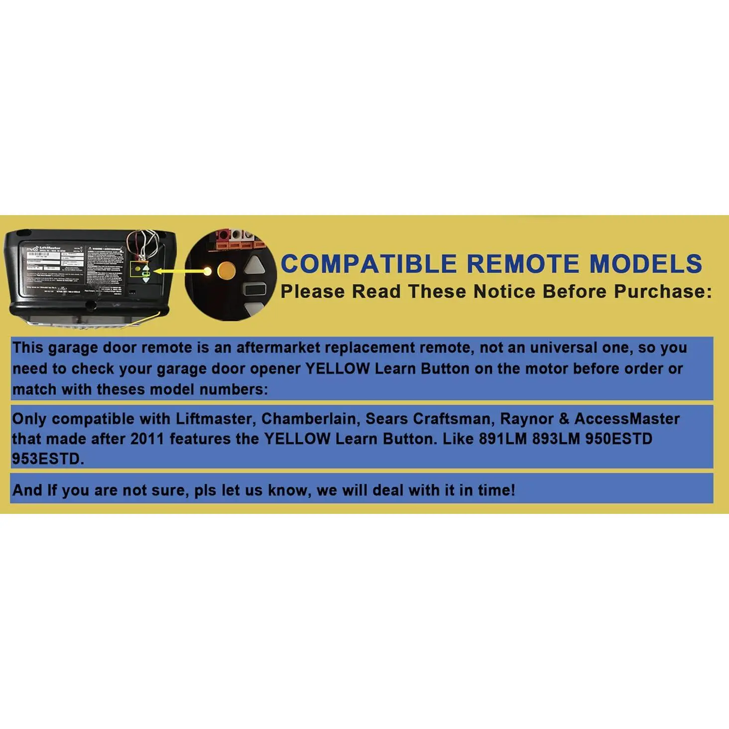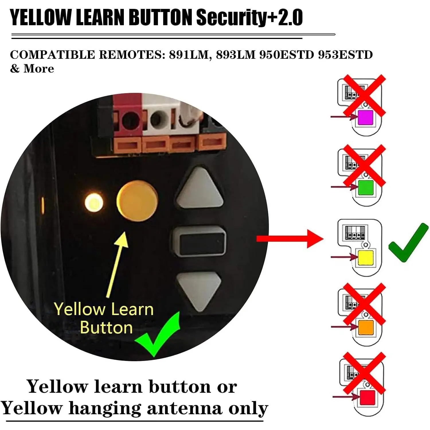 COMPATIBLE WITH YELLOW BUTTON COLORS ONLY - This remote is an after-market replacement remote, not a universal one, only compatible with Yellow Learn Button Security+2.0 on the motor unitREPLACEMENT REMOTES MODELS - It can only work for most standard Chamberlain, Liftmaster, Sears Craftsman, Raynor & AccessMaster that made after 2011 features the YELLOW Learn button.891LM 893LM 950ESTD 953ESTD & MoreLATEST RF TECHNOLOGY & STRONG SECURITY ENCRYPTED DESIGN - Ensure better range + Security+ 2.0 + Rolling code technology to protect your home’s access and connection1 BUTTON SIMPLE MINI ELLIPSE REMOTES + HIGH QUALITY MATERIALS - It is small enough to fit well on a keychain, pocket, backpack, easy to carry.Plus metal reinforced key chain frame, more solid and beautiful than a bulky, 100% plastic remoteEXCELLENT AFTER-SALES SERVICE - If there has any problem after you buy the remote, we will provide professional customer service to deal with it in time.Even pay the full money back to you#91,648 in Tools & Home Improvement (See Top 100 in Tools & Home Improvement)# 411 in Garage Door Keypads & Remotes#91,648 in Tools & Home Improvement (See Top 100 in Tools & Home Improvement)# 411 in Garage Door Keypads & Remotes