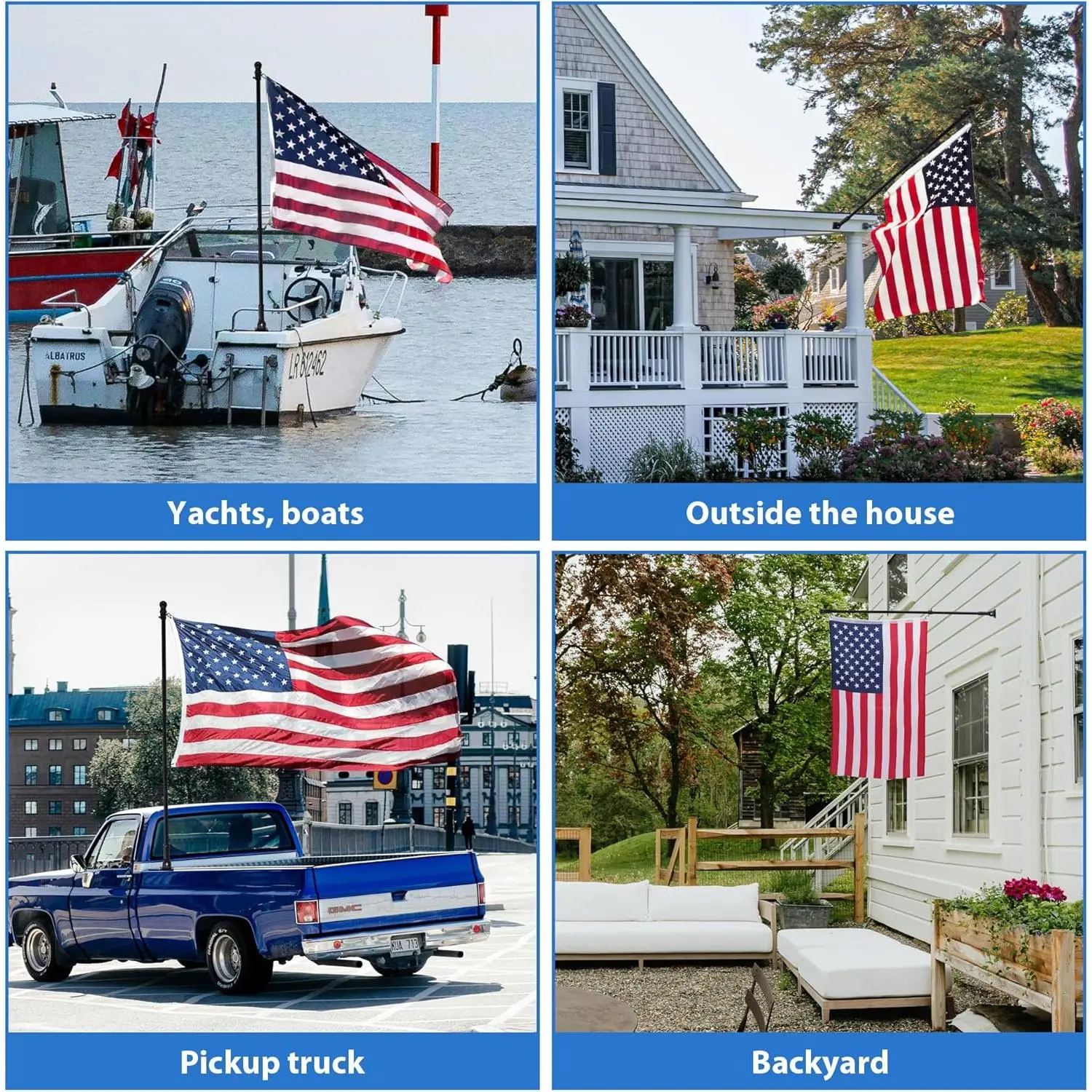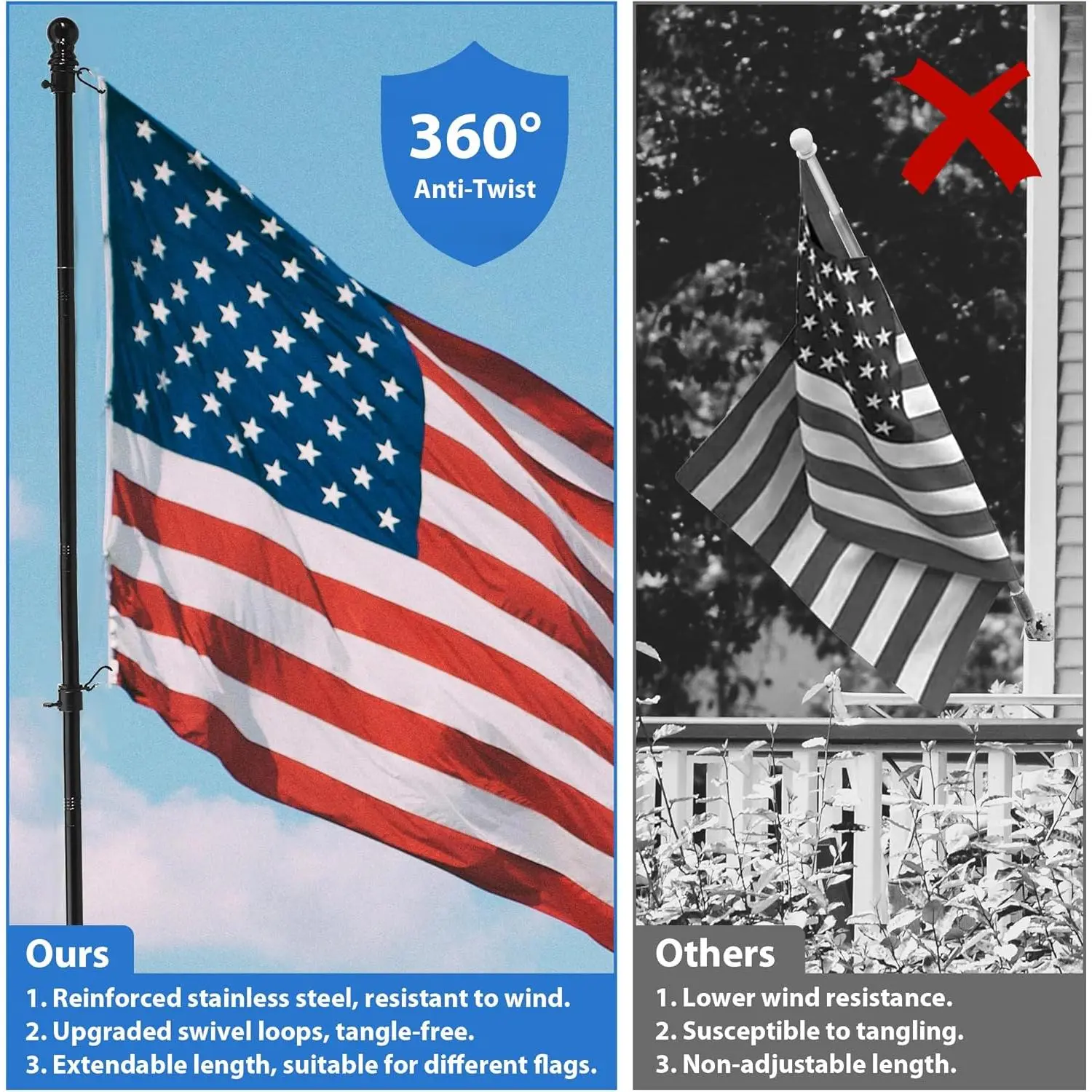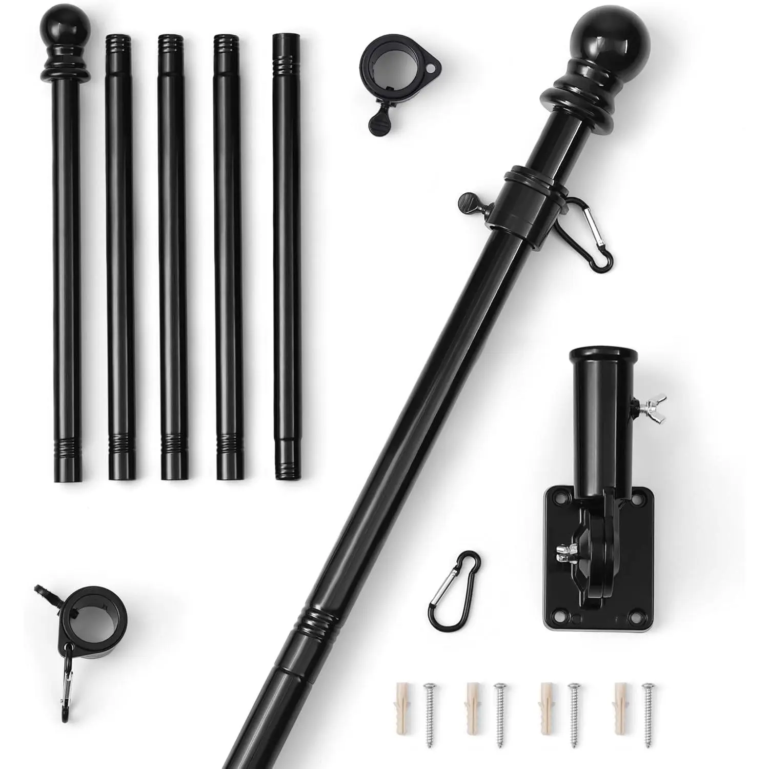 Complete Flag Pole Kit: This flag pole kit includes 4 sections of a durable flag pole, a flag pole holder for outside house, a decorative flag topper, 4 screws and nuts, 2 anti-tangle rings, and a flag pole mount.The anti-tangle rings prevent the flag from wrapping, ensuring a smooth display.Ideal for American flags for outside with pole, or eagles flags for outside, this flagpole is perfect for home, yard, garden, or truck use.(Flag not included)Strong & Rustproof: Made from premium stainless steel, this flag pole for outside house is rust-resistant, weatherproof, and built for long-term outdoor use.The flag holder ensures stability in harsh weather, making it perfect for flags for outside.Whether mounted as a house flag pole, truck flag pole, or garden flag holder, it offers durability and strength for year-round flag displayAdjustable Mount: the flag pole bracket features a 0°-180° adjustable mount, allowing you to display the flag flat, at 90°, or at a 45° angle for a classic display.This flag mount for house provides flexibility to fit your preferred setup, making it ideal for American flags for outside with pole kit, seasonal decorations, or event flags.The sturdy design keeps your flagpole secure in different mounting positions, ensuring a perfect display for any occasionAdjustable Length: This flag pole extends from 1.3 ft to 5 ft, accommodating flag poles for 3x5 flags outdoor.Whether for a black American flag, Trump flag, or custom flag, this outdoor flag pole offers the perfect height for your display.The telescopic design ensures easy installation and adjustment, making it a great flag pole for truck, house, or yardVersatile Applications: Designed for multiple uses, this heavy-duty flag pole is perfect for yards, houses, gardens, or vehicles. Whether mounted as a truck flag pole mount kit, car flag pole, or garden flag pole, it enhances celebrations, patriotic displays, and seasonal decorations. Ideal for Thanksgiving, Christmas, and Independence Day, this flag pole holder is a must-have for flag enthusiasts