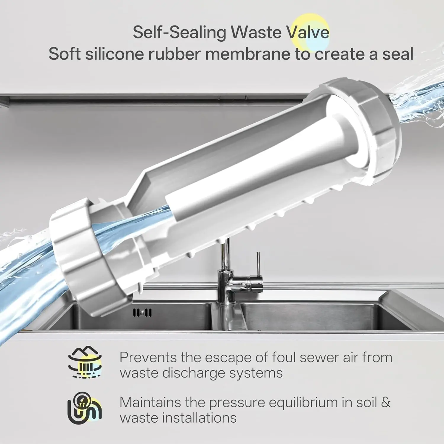 Admits Air: The waterless trap actively eliminates negative pressure within the waste system by opening and allowing in fresh air until a state of equilibrium with atmosphere is reached.This means that secondary venting of the waste system via the inclusion of air admittance valves in the waste system is no longer necessary.