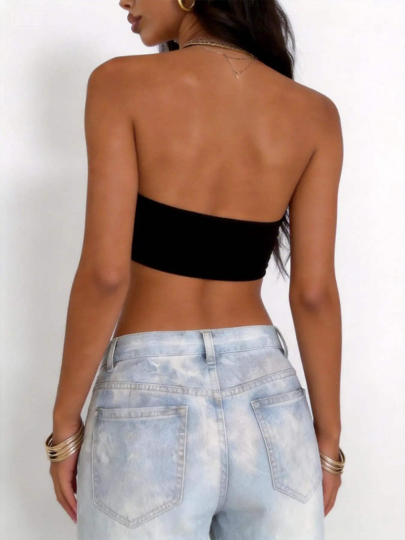 1-Piece Women's Sexy Vacation Halter Cami Top, Black Tie Front Ruched Backless Crop Top for Women Beach Wear, Club Events and Casual Outings