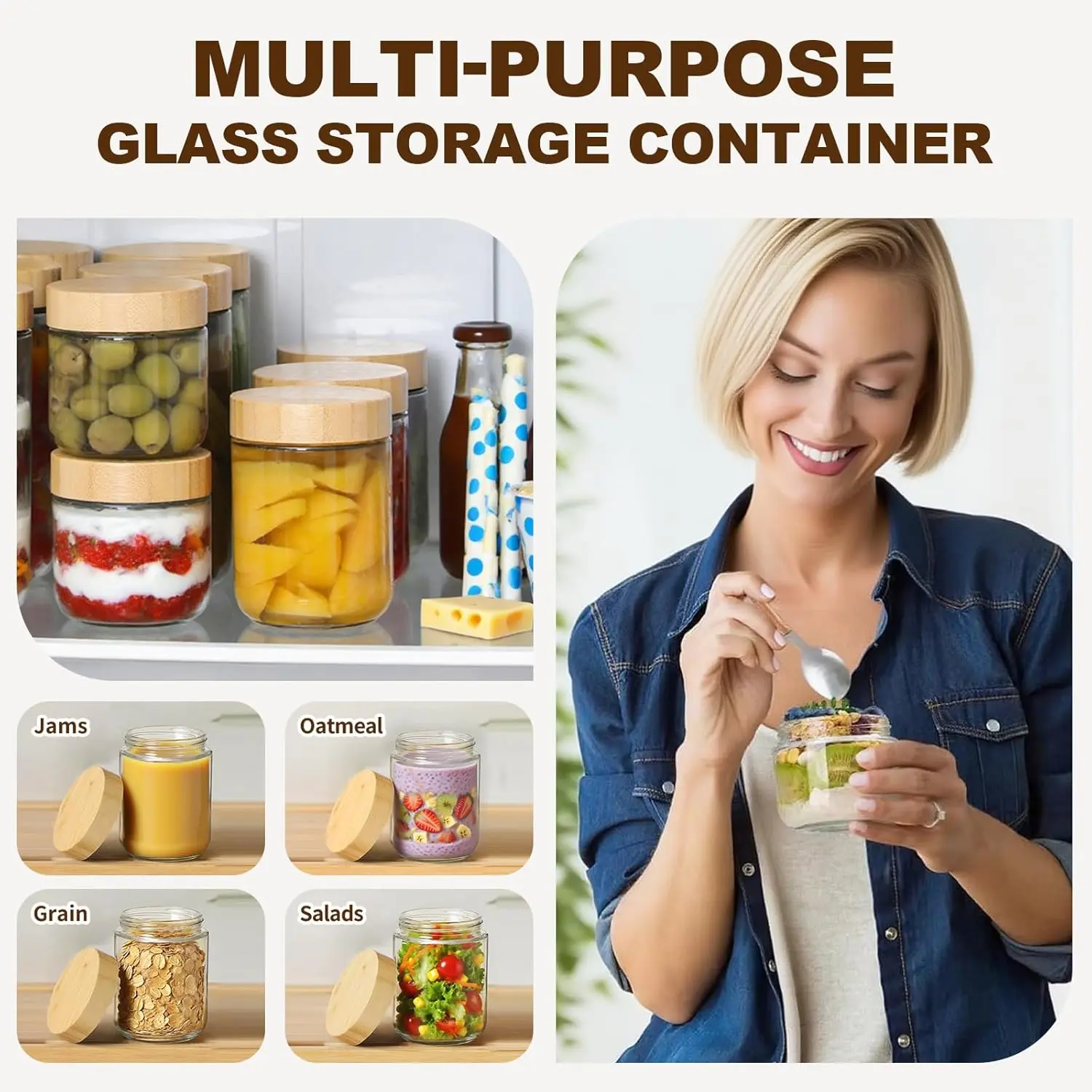 ·Versatile Airtight Preservative jars for overnight oats: These jars for overnight oats with bamboo lids can be used to store overnight oats, yogurt, salads, pickles, candies, spices, and meals. The wide mouth design makes filling, serving, and cleaning easy, and the silicone gasket inside the lid ensures all food stays fresh and prevents spills. Whether you're taking them to work, school, or a picnic, there's no need to worry about food leaking.