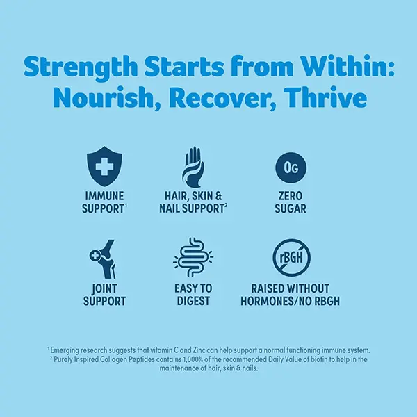 Purely Inspired Collagen Peptides provides 20g of collagen, 18g of protein, and 0g of sugar in a smooth, easy-to-mix unflavored formula. Each serving also includes 300mcg of Biotin to support healthy hair, skin, and nails. 20 servings per container.