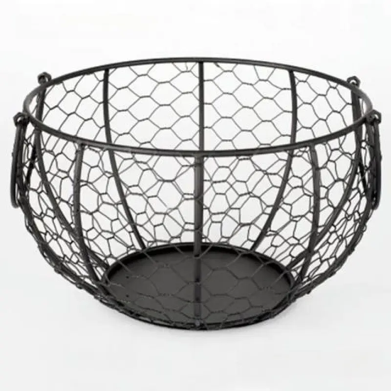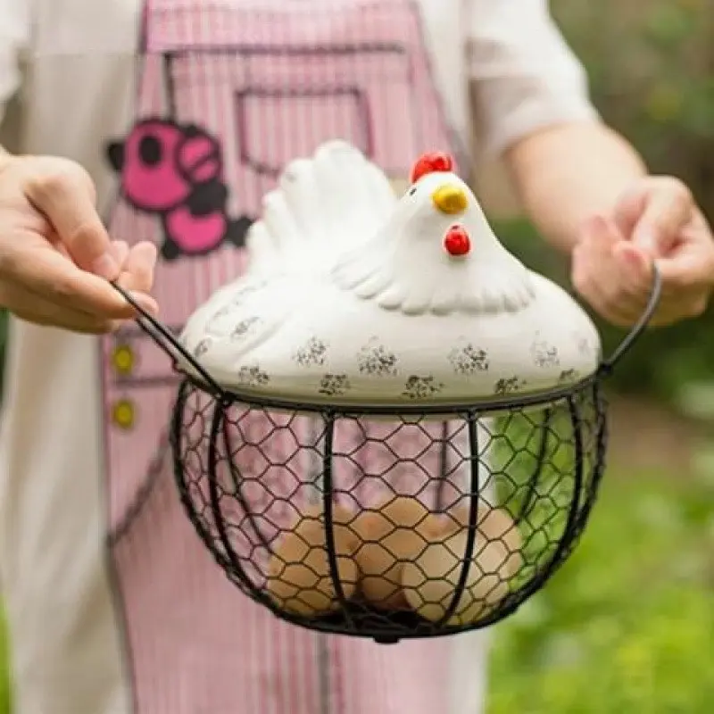 Farmhouse Style Ceramic Chicken Egg Basket with Metal Wire and Lid, Decorative Multi-Functional Kitchen Storage Box for Eggs Fruits Vegetables