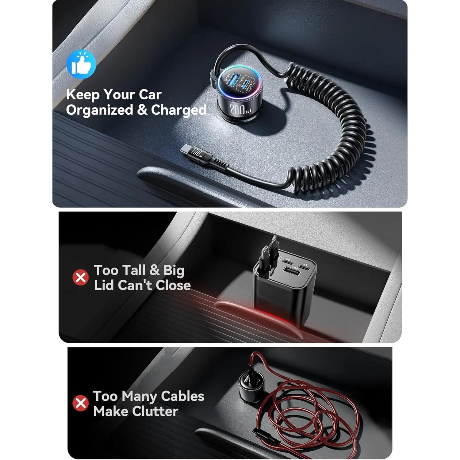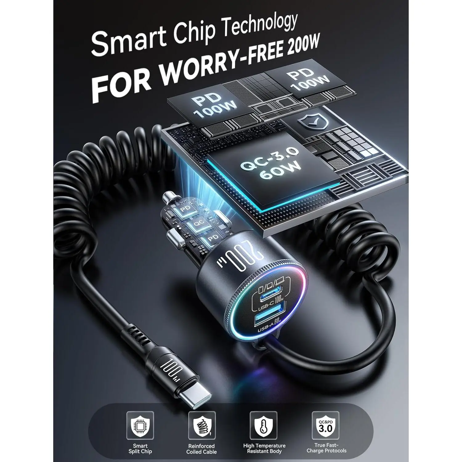 200W Car Charger USB C, PD100W Fast Charge w/100W Type C Fast Charging 5FT Coiled Cable, PD3.0/QC4.0/PPS Cigarette Lighter Phone Adapter for iPhone 17/16 ProMax, MacBook Pro/Air, Samsung S26/S25, iPad